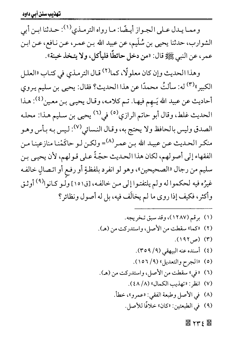 وهذا الحديث وإن كان معلولًا، كما (¬٢) قال الترمذي في كتاب «العلل الكبير» (¬٣) له: سألتُ محمدًا عن هذا الحديث؟ فقال: يحيى بن سليم يروي أحاديث عن عبيد الله يَهِم فيها. تم كلامه، وقال يحيى بن معين (¬٤): هذا الحديث غلط، وقال أبو حاتم الرازي (¬٥) في (¬٦) يحيى بن سليم هذا: محله الصدق وليس بالحافظ ولا يحتج به، وقال النسائي (¬٧): ليس به بأس وهو منكر الحديث عن عبيد الله بن عمر (¬٨) = ولكن لو حاكَمْنا منازعينا من الفقهاء إلى أصولهم، لكان هذا الحديث حجّةً على قولهم، لأن يحيى بن سليم من رجال «الصحيحين»، وهو لو انفرد بلفظةٍ أو رفعٍ أو اتصالٍ خالفه غيرُه فيه لحكموا له ولم يلتفتوا إلى من خالفه، [ق ١٥١] ولو كانوا (¬٩) أوثق وأكثر، فكيف إذا روى ما لم يخالَف فيه، بل له أصول ونظائر؟
