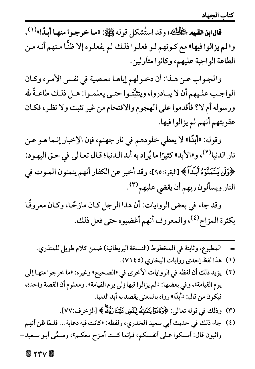 (¬٢) يؤيد ذلك أن لفظه في الروايات الأخرى في «الصحيح» وغيره: «ما خرجوا منها إلى يوم القيامة»، وفي بعضها: «لم يزالوا فيها إلى يوم القيامة». ومعلوم أن القصة واحدة، فيكون من قال: «أبدًا» رواه بالمعنى يقصد به أبد الدنيا.