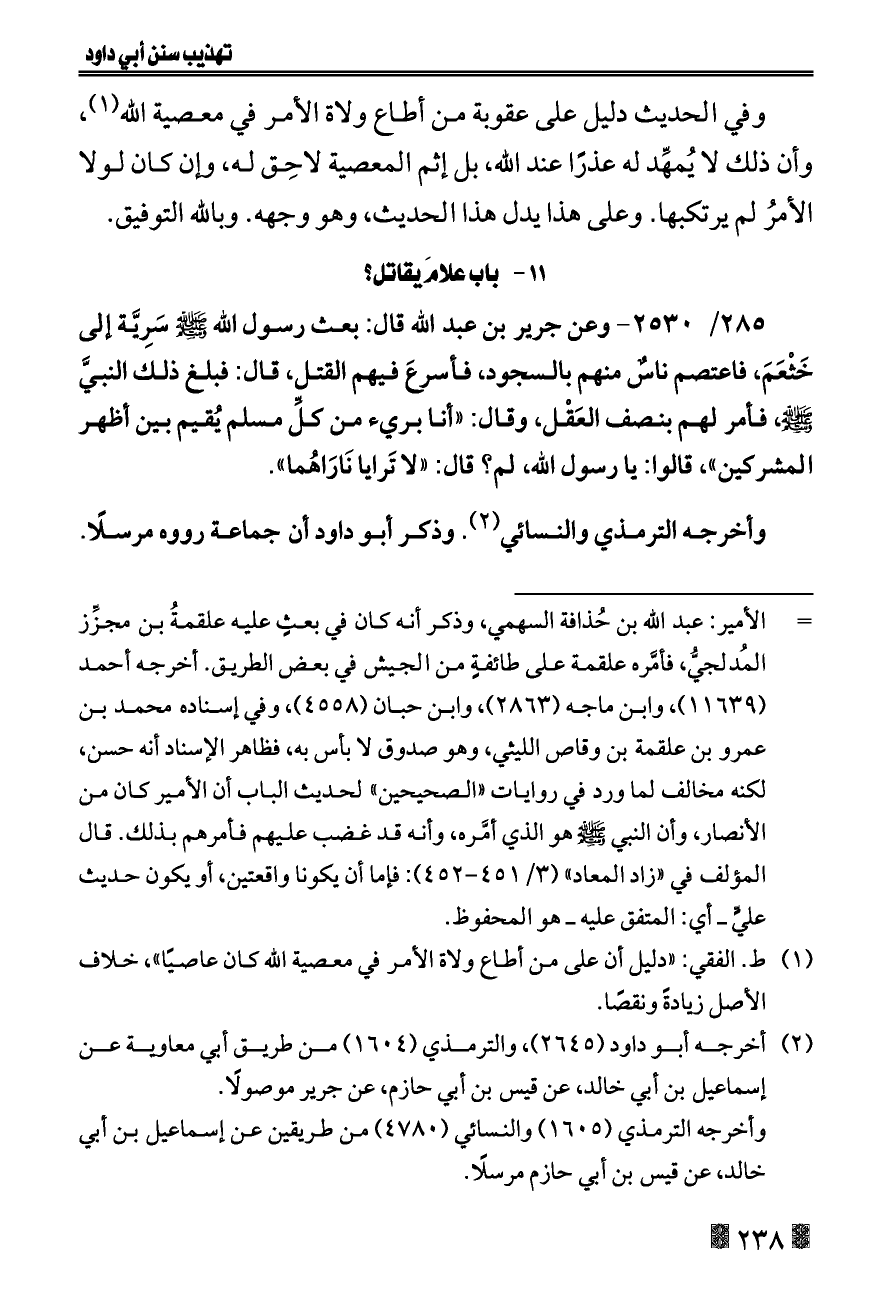 ٢٨٥/ ٢٥٣٠ - وعن جرير بن عبد الله قال: بعث رسول الله - صلى الله عليه وسلم - سَرِيَّة إلى خَثْعَمَ، فاعتصم ناسٌ منهم بالسجود، فأسرعَ فيهم القتل، قال: فبلغ ذلك النبيَّ - صلى الله عليه وسلم -، فأمر لهم بنصف العَقْل، وقال: «أنا بريء من كلِّ مسلم يُقيم بين أظهر المشركين»، قالوا: يا رسول الله، لم؟ قال: «لا تَرايا نَارَاهُما».