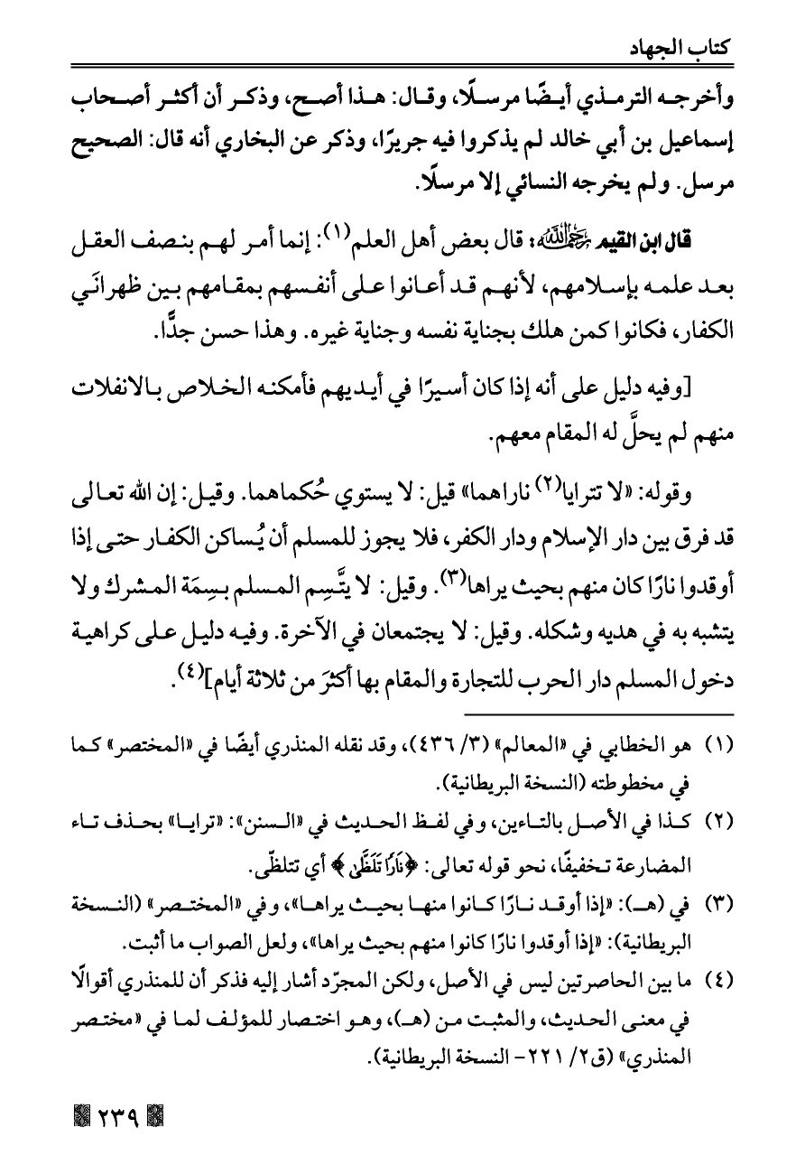 وقوله: «لا تترايا (¬٢) ناراهما» قيل: لا يستوي حُكماهما. وقيل: إن الله تعالى قد فرق بين دار الإسلام ودار الكفر، فلا يجوز للمسلم أن يُساكن الكفار حتى إذا أوقدوا نارًا كان منهم بحيث يراها (¬٣). وقيل: لا يتَّسِم المسلم بسِمَة المشرك ولا يتشبه به في هديه وشكله. وقيل: لا يجتمعان في الآخرة. وفيه دليل على كراهية دخول المسلم دار الحرب للتجارة والمقام بها أكثرَ من ثلاثة أيام] (¬٤).