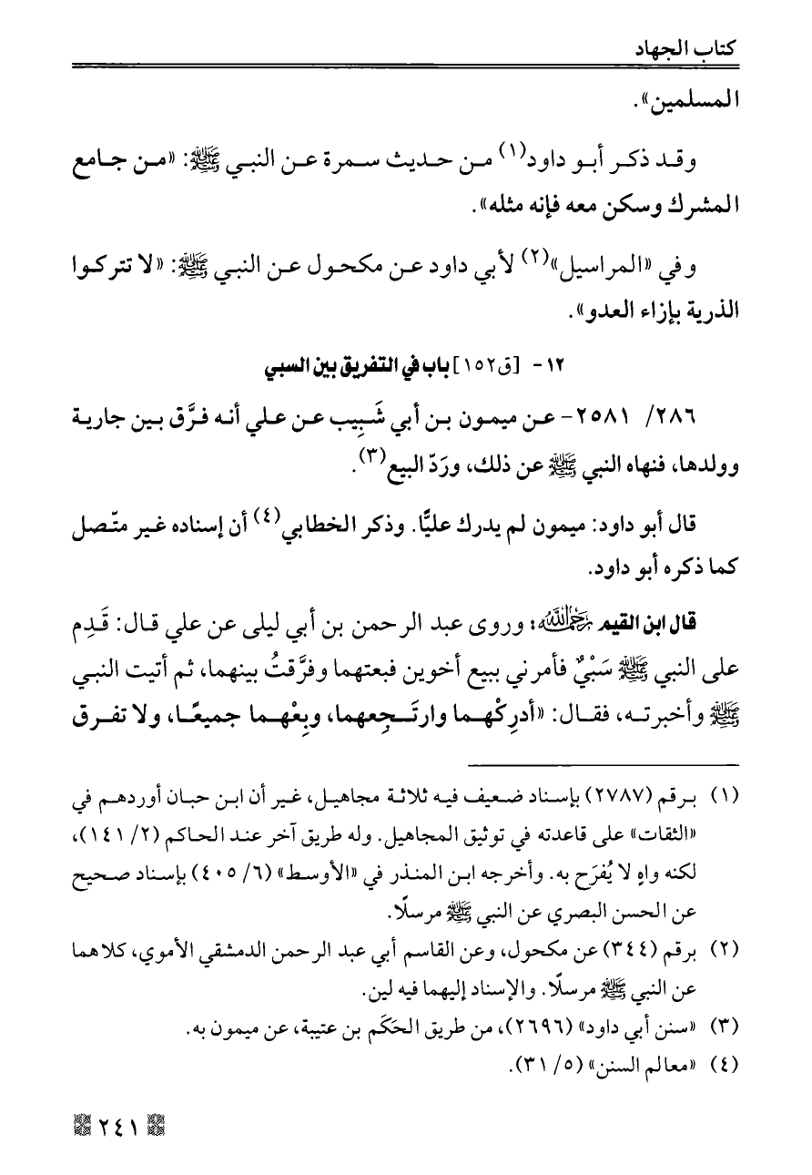 قال ابن القيم - رحمه الله -: وروى عبد الرحمن بن أبي ليلى عن علي قال: قَدِم على النبي - صلى الله عليه وسلم - سَبْيٌ فأمرني ببيع أخوين فبعتهما وفرَّقتُ بينهما، ثم أتيت النبي - صلى الله عليه وسلم - وأخبرته، فقال: «أدرِكْهما وارتَجِعهما، وبِعْهما جميعًا، ولا تفرق
