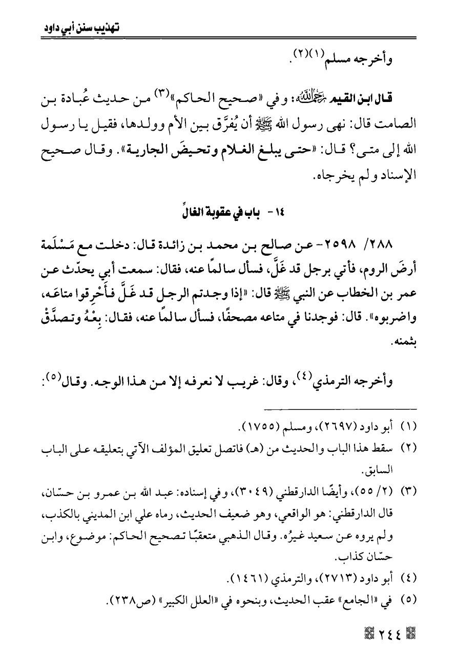 ٢٨٨/ ٢٥٩٨ - عن صالح بن محمد بن زائدة قال: دخلت مع مَسْلَمة أرضَ الروم، فأتي برجل قد غَلَّ، فسأل سالمًا عنه، فقال: سمعت أبي يحدّث عن عمر بن الخطاب عن النبي - صلى الله عليه وسلم - قال: «إذا وجدتم الرجل قد غَلَّ فأَحْرِقوا متاعَه، واضربوه». قال: فوجدنا في متاعه مصحفًا، فسأل سالمًا عنه، فقال: بِعْهُ وتصدَّقْ بثمنه.
