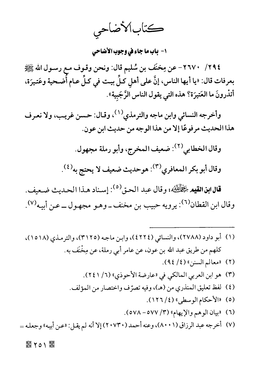 ٢٩٤/ ٢٦٧٠ - عن مِخنَف بن سُليم قال: ونحن وقوف مع رسول الله - صلى الله عليه وسلم - بعرفات قال: «يا أيها الناس، إنَّ على أهلِ كلِّ بيت في كلِّ عام أُضحية وعَتيرَة، أتدْرونَ ما العَتيرَة؟ هذه التي يقول الناس الرَّجَبِية».