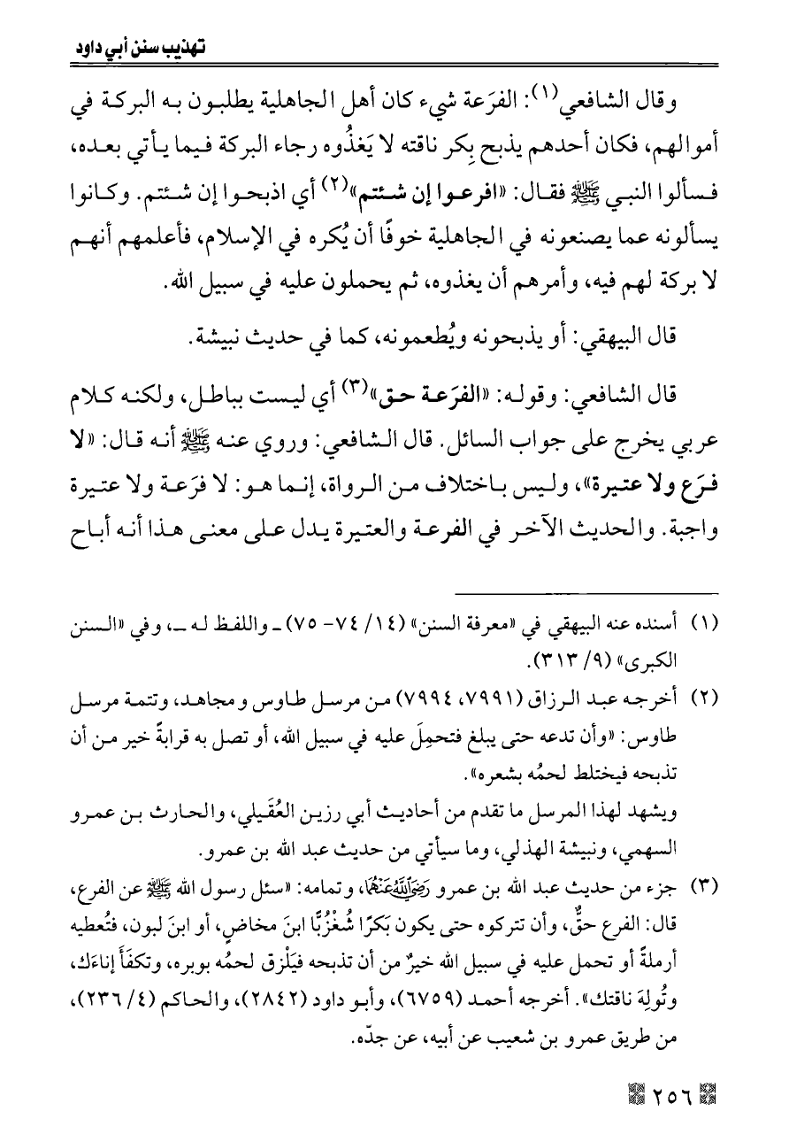وقال الشافعي (¬١): الفرَعة شيء كان أهل الجاهلية يطلبون به البركة في أموالهم، فكان أحدهم يذبح بِكر ناقته لا يَغذُوه رجاء البركة فيما يأتي بعده، فسألوا النبي - صلى الله عليه وسلم - فقال: «افرعوا إن شئتم» (¬٢) أي اذبحوا إن شئتم. وكانوا يسألونه عما يصنعونه في الجاهلية خوفًا أن يُكره في الإسلام، فأعلمهم أنهم لا بركة لهم فيه، وأمرهم أن يغذوه، ثم يحملون عليه في سبيل الله.