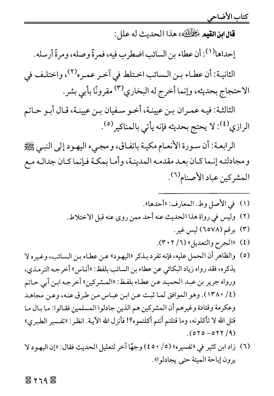 (¬٥) والظاهر أن الحمل عليه، فإنه تفرد بذكر «اليهود» عن عطاء بن السائب، وغيره لا يذكره، فقد رواه زياد البكائي عن عطاء بن السائب بلفظ: «أناس» أخرجه الترمذي، ورواه جرير بن عبد الحميد عن عطاء بلفظ: «المشركين» أخرجه ابن أبي حاتم (٤/ ١٣٨٠). وهو الموافق لما ثبت عن ابن عباس من طرق عنه، وعن مجاهد وعكرمة وقتادة وغيرهم أن المشركين هم الذين جادلوا المسلمين فقالوا: ما بال ما قتل الله لا تأكلونه، وما قتلتم أنتم أكلتموه؟! فأنزل الله الآية. انظر: «تفسير الطبري» (٩/ ٥٢٢ - ٥٢٥).