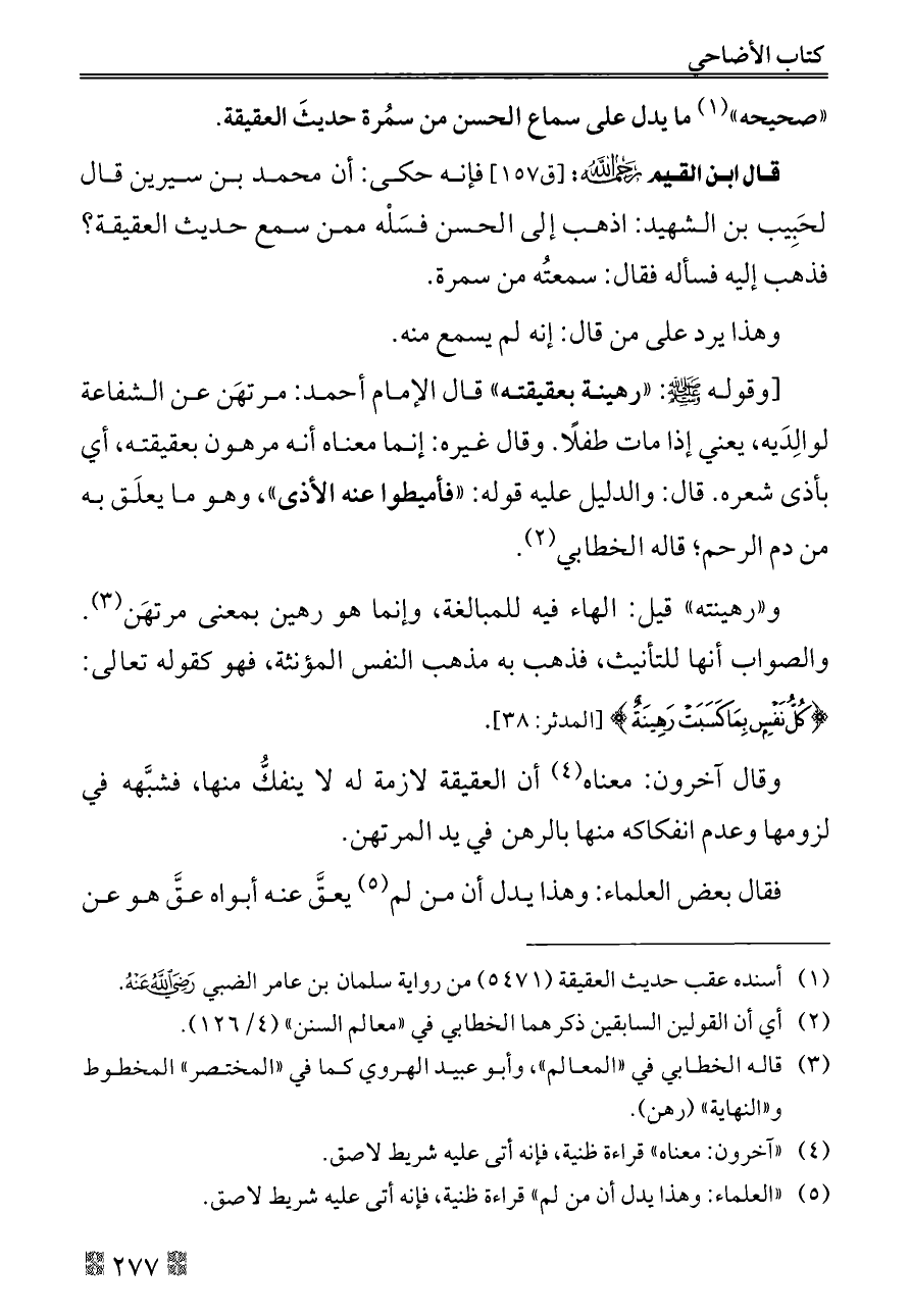 قال ابن القيم - رحمه الله -: [ق ١٥٧] فإنه حكى: أن محمد بن سيرين قال لحَبِيب بن الشهيد: اذهب إلى الحسن فسَلْه ممن سمع حديث العقيقة؟ فذهب إليه فسأله فقال: سمعتُه من سمرة.