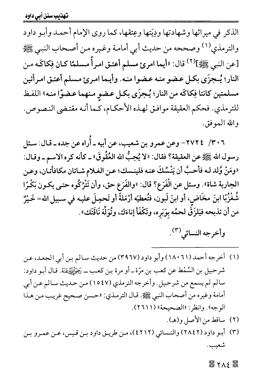 الذكر في ميراثها وشهادتها ودِيَتها وعِتقها، كما روى الإمام أحمد وأبو داود والترمذي (¬١) وصححه من حديث أبي أمامة وغيره من أصحاب النبي - صلى الله عليه وسلم -[عن النبي - صلى الله عليه وسلم -] (¬٢) قال: «أيما امرئ مسلم أعتق امرأً مسلمًا كان فِكاكَه من النار؛ يُجزَى بكل عضو منه عضوا منه. وأيما امرئ مسلم أعتق امرأتين مسلمتين كانتا فِكاكَه من النار؛ يُجزَى بكل عضوٍ منهما عضوًا منه» اللفظ للترمذي. فحكم العقيقة موافق لهذه الأحكام، كما أنه مقتضى النصوص. والله الموفق.