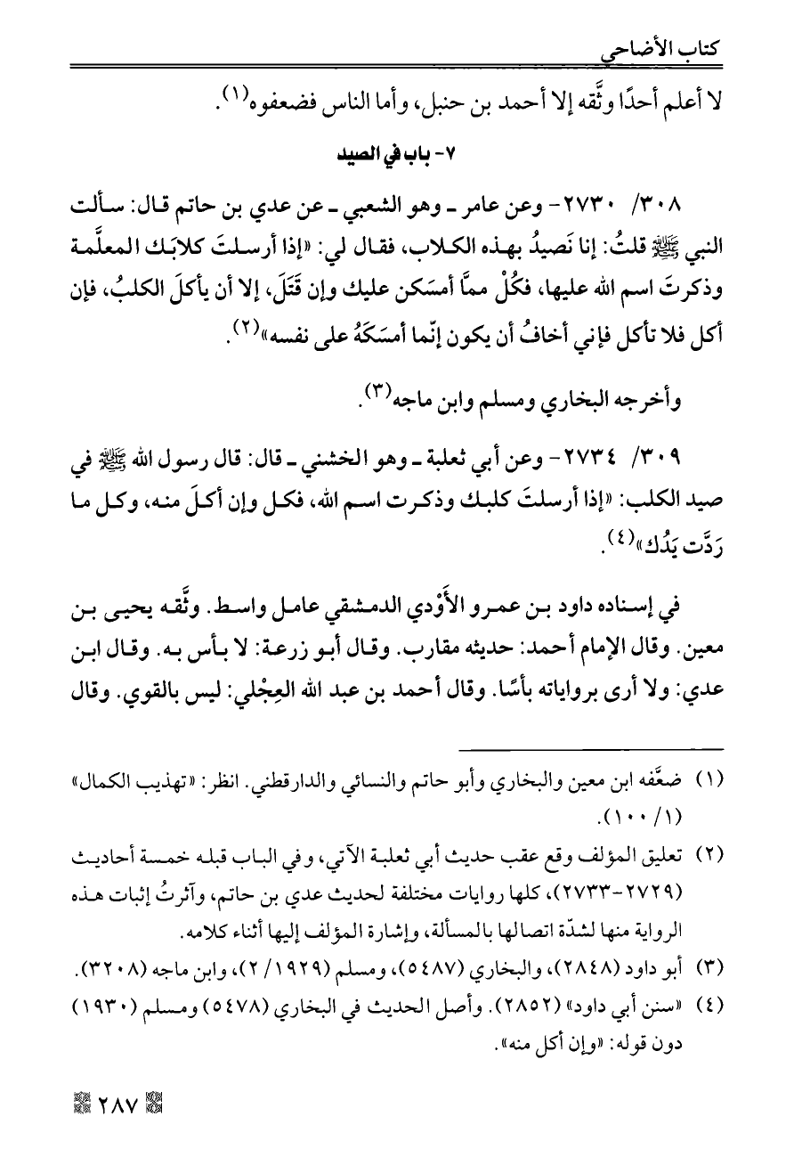 (¬٢) تعليق المؤلف وقع عقب حديث أبي ثعلبة الآتي، وفي الباب قبله خمسة أحاديث (٢٧٢٩ - ٢٧٣٣)، كلها روايات مختلفة لحديث عدي بن حاتم، وآثرتُ إثبات هذه الرواية منها لشدّة اتصالها بالمسألة، وإشارة المؤلف إليها أثناء كلامه.