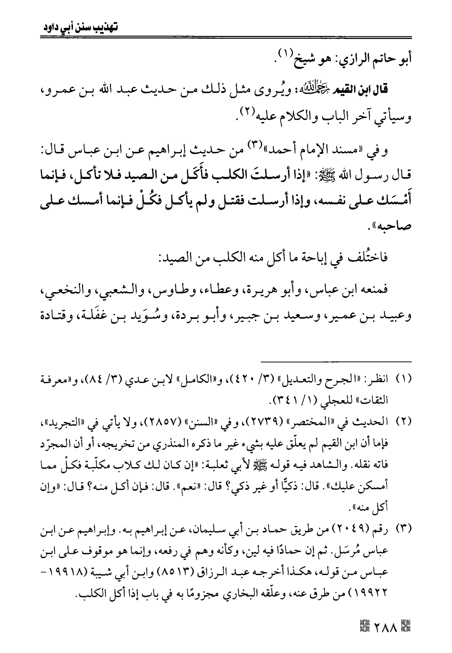 (¬٢) الحديث في «المختصر» (٢٧٣٩)، وفي «السنن» (٢٨٥٧)، ولا يأتي في «التجريد»، فإما أن ابن القيم لم يعلّق عليه بشيء غير ما ذكره المنذري من تخريجه، أو أن المجرّد فاته نقله. والشاهد فيه قوله - صلى الله عليه وسلم - لأبي ثعلبة: «إن كان لك كلاب مكلّبة فكلْ مما أمسكن عليك». قال: ذكيًّا أو غير ذكي؟ قال: «نعم». قال: فإن أكل منه؟ قال: «وإن أكل منه».