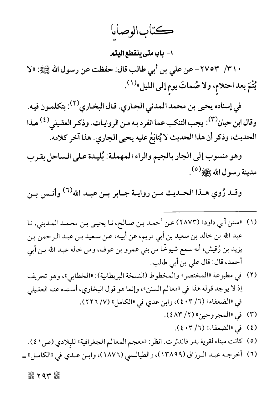٣١٠/ ٢٧٥٣ - عن علي بن أبي طالب قال: حفظت عن رسول الله - صلى الله عليه وسلم -: «لا يُتْمَ بعد احتلامٍ، ولا صُماتَ يومٍ إلى الليل» (¬١).