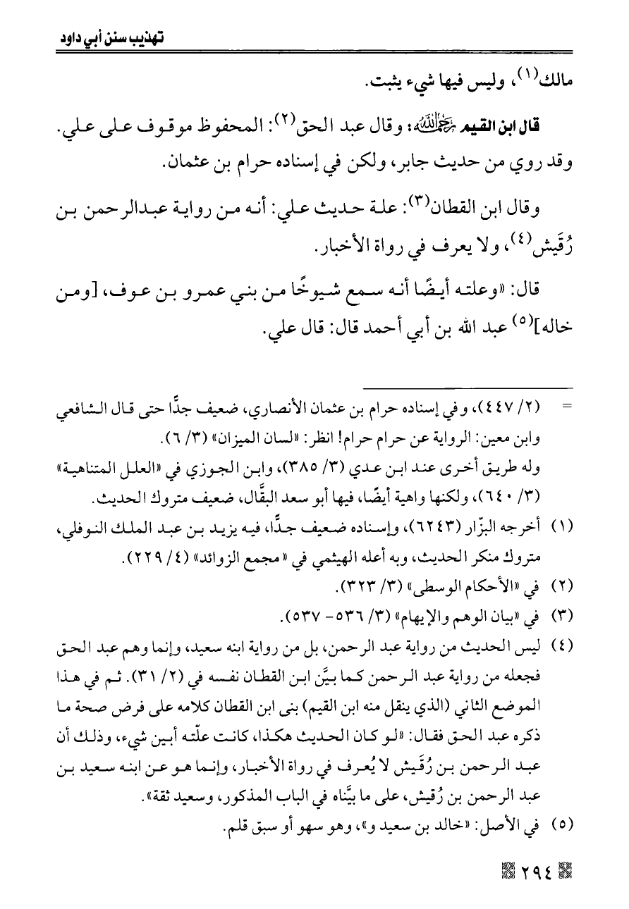 (¬٤) ليس الحديث من رواية عبد الرحمن، بل من رواية ابنه سعيد، وإنما وهم عبد الحق فجعله من رواية عبد الرحمن كما بيَّن ابن القطان نفسه في (٢/ ٣١). ثم في هذا الموضع الثاني (الذي ينقل منه ابن القيم) بنى ابن القطان كلامه على فرض صحة ما ذكره عبد الحق فقال: «لو كان الحديث هكذا، كانت علّته أبين شيء، وذلك أن عبد الرحمن بن رُقَيش لا يُعرف في رواة الأخبار، وإنما هو عن ابنه سعيد بن عبد الرحمن بن رُقيش، على ما بيَّناه في الباب المذكور، وسعيد ثقة».