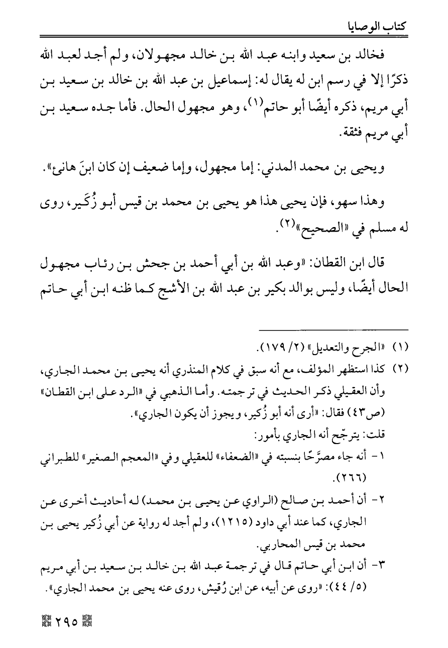 أن ابن أبي حاتم قال في ترجمة عبد الله بن خالد بن سعيد بن أبي مريم (٥/ ٤٤): «روى عن أبيه، عن ابن رُقيش، روى عنه يحيى بن محمد الجاري».
