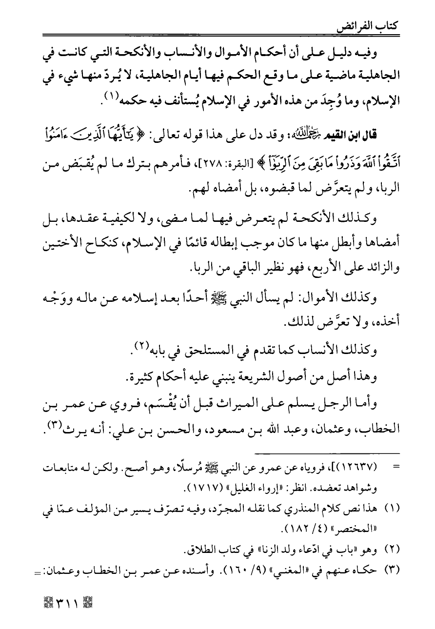 قال ابن القيم - رحمه الله -: وقد دل على هذا قوله تعالى: {يَاأَيُّهَا الَّذِينَ آمَنُوا اتَّقُوا اللَّهَ وَذَرُوا مَا بَقِيَ مِنَ الرِّبَا} [البقرة: ٢٧٨]، فأمرهم بترك ما لم يُقبَض من الربا، ولم يتعرَّض لما قبضوه، بل أمضاه لهم.