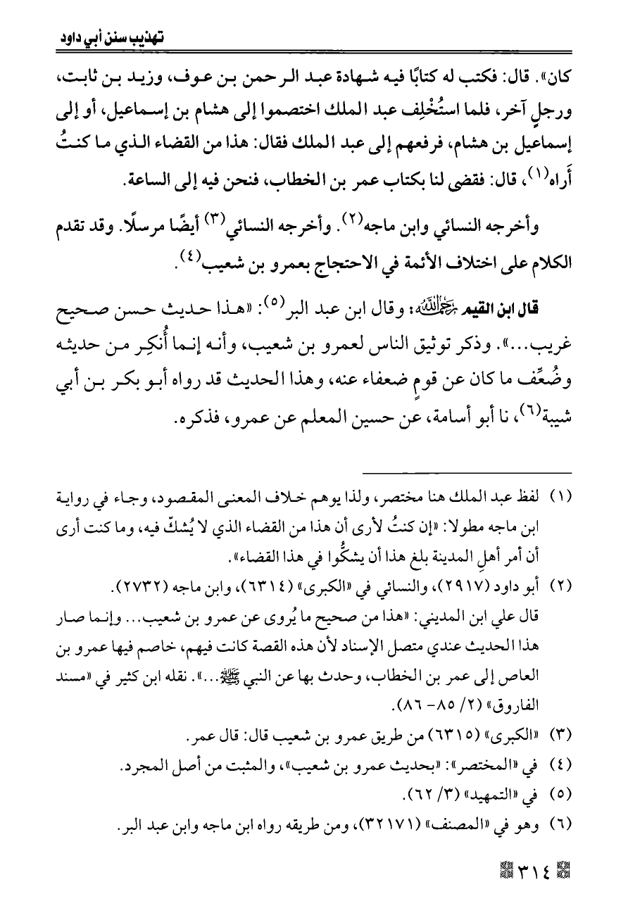 قال ابن القيم - رحمه الله -: وقال ابن عبد البر (¬٥): «هذا حديث حسن صحيح غريب ... ». وذكر توثيق الناس لعمرو بن شعيب، وأنه إنما أُنكِر من حديثه وضُعِّف ما كان عن قومٍ ضعفاء عنه، وهذا الحديث قد رواه أبو بكر بن أبي شيبة (¬٦)، نا أبو أسامة، عن حسين المعلم عن عمرو، فذكره.