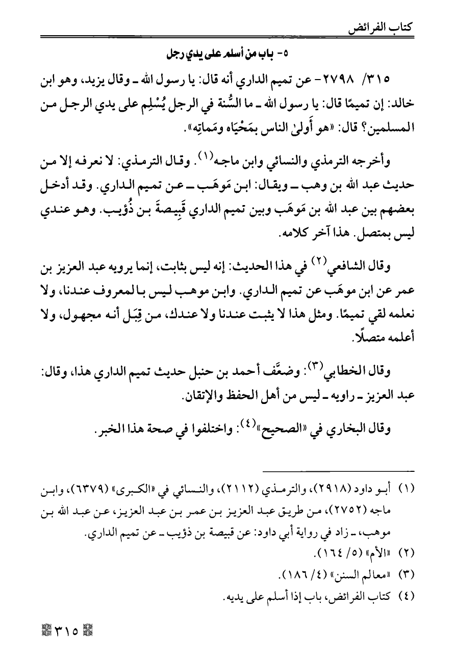٣١٥/ ٢٧٩٨ - عن تميم الداري أنه قال: يا رسول الله ــ وقال يزيد، وهو ابن خالد: إن تميمًا قال: يا رسول الله ــ ما السُّنة في الرجل يُسْلِم على يدي الرجل من المسلمين؟ قال: «هو أَولى الناس بمَحْيَاه ومَماتِه».