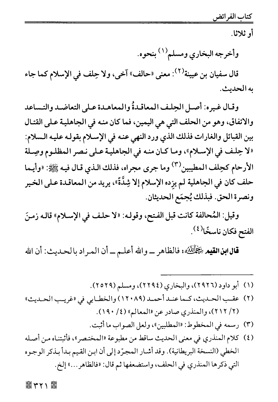 (¬٤) كلام المنذري في معنى الحديث ساقط من مطبوعة «المختصر»، فأثبتناه من أصله الخطي (النسخة البريطانية). وقد أشار المجرّد إلى أن ابن القيم بدأ بذكر الوجوه التي ذكرها المنذري في الحلف، واستضعفها ثم قال: «فالظاهر ... » إلخ.