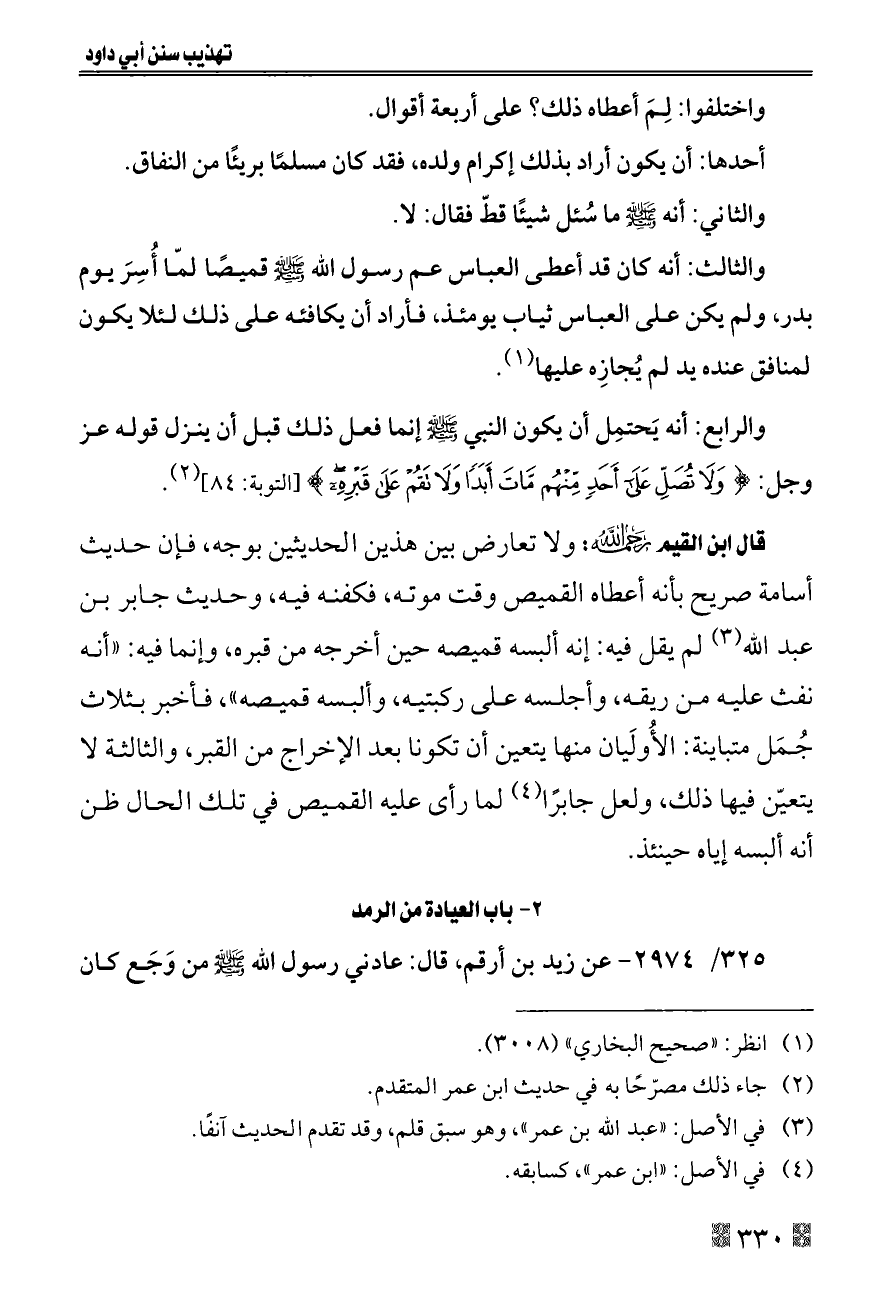 ٣٢٥/ ٢٩٧٤ - عن زيد بن أرقم، قال: عادني رسول الله - صلى الله عليه وسلم - من وَجَع كان