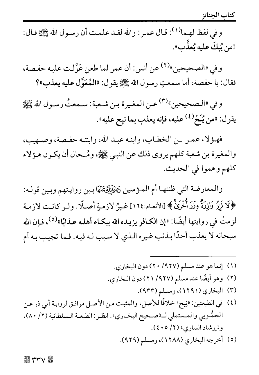 وفي لفظ لهما (¬٣): قال عمر: والله لقد علمت أن رسول الله - صلى الله عليه وسلم - قال: «من يُبكَ عليه يُعذَّب».