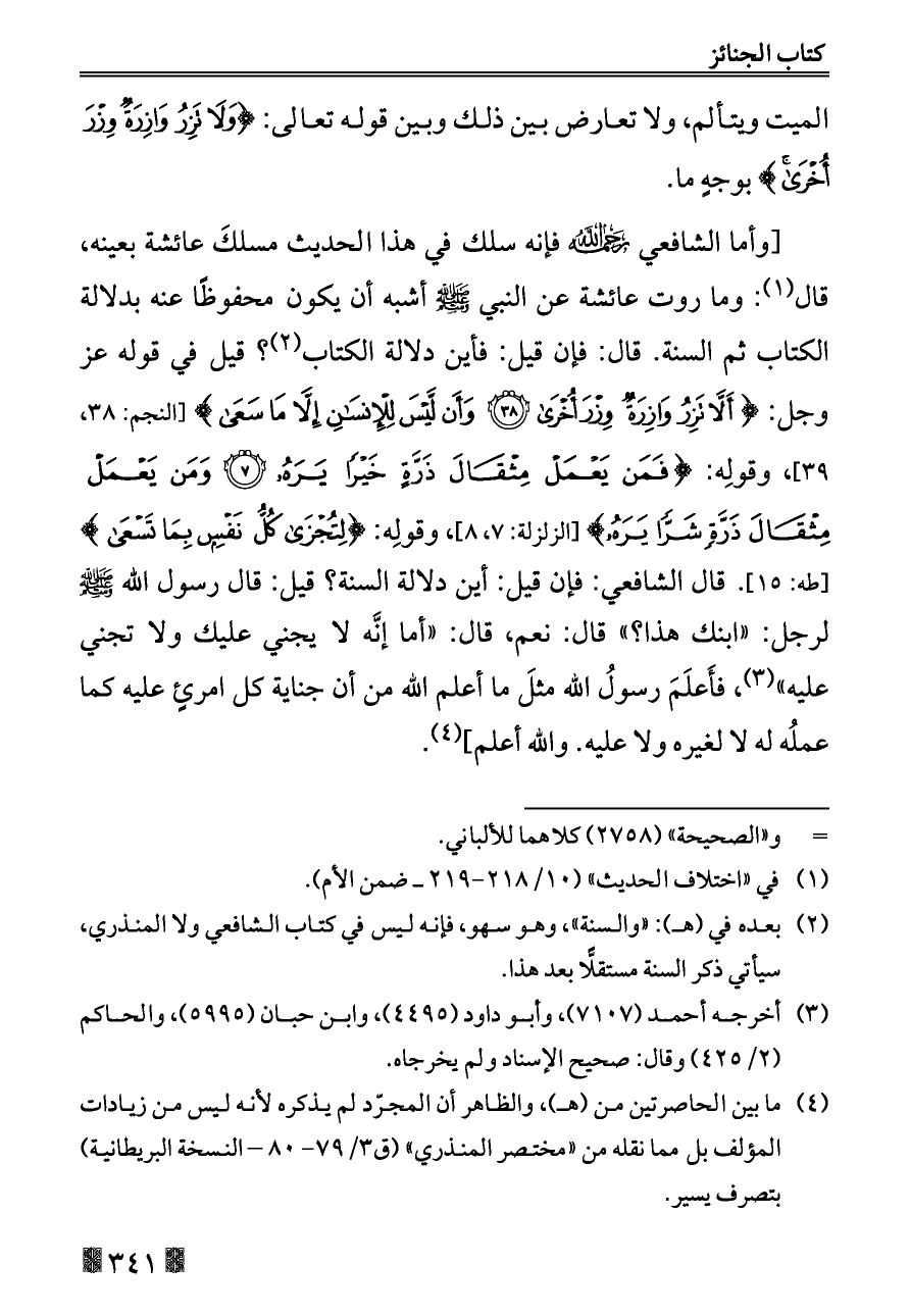 [وأما الشافعي - رحمه الله - فإنه سلك في هذا الحديث مسلكَ عائشة بعينه، قال (¬١): وما روت عائشة عن النبي - صلى الله عليه وسلم - أشبه أن يكون محفوظًا عنه بدلالة الكتاب ثم السنة. قال: فإن قيل: فأين دلالة الكتاب (¬٢)؟ قيل في قوله عز وجل: {أَلَّا تَزِرُ وَازِرَةٌ وِزْرَ أُخْرَى (٣٨) وَأَنْ لَيْسَ لِلْإِنْسَانِ إِلَّا مَا سَعَى} [النجم: ٣٨، ٣٩]، وقولِه: {فَمَنْ يَعْمَلْ مِثْقَالَ ذَرَّةٍ خَيْرًا يَرَهُ (٧) وَمَنْ يَعْمَلْ مِثْقَالَ ذَرَّةٍ شَرًّا يَرَهُ} [الزلزلة: ٧، ٨]، وقولِه: {لِتُجْزَى كُلُّ نَفْسٍ بِمَا تَسْعَى} [طه: ١٥]. قال الشافعي: فإن قيل: أين دلالة السنة؟ قيل: قال رسول الله - صلى الله عليه وسلم - لرجل: «ابنك هذا؟» قال: نعم، قال: «أما إنَّه لا يجني عليك ولا تجني عليه» (¬٣)، فأَعلَمَ رسولُ الله مثلَ ما أعلم الله من أن جناية كل امرئٍ عليه كما عملُه له لا لغيره ولا عليه. والله أعلم] (¬٤).