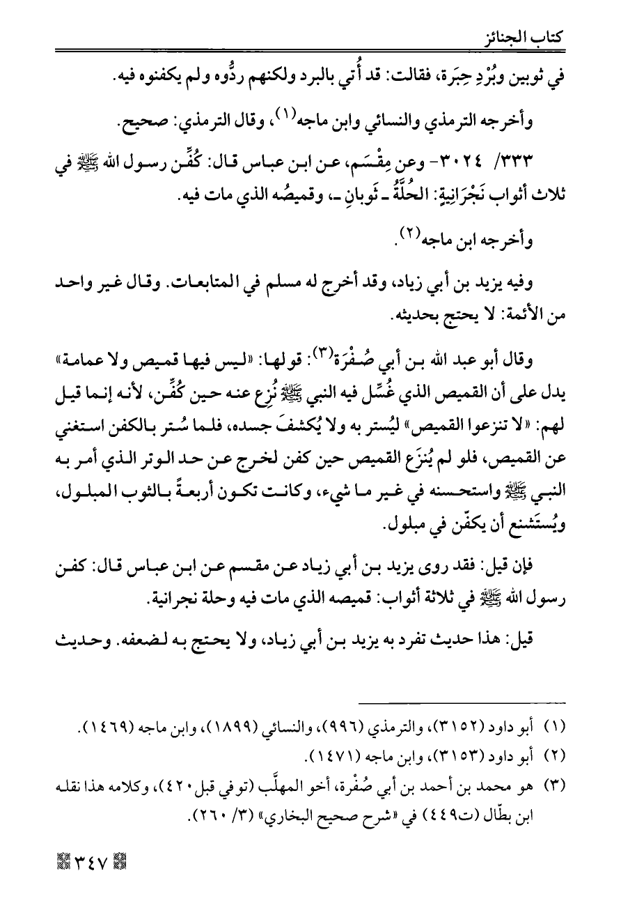 ٣٣٣/ ٣٠٢٤ - وعن مِقْسَم، عن ابن عباس قال: كُفِّن رسول الله - صلى الله عليه وسلم - في ثلاث أثواب نَجْرَانِيةٍ: الحُلَّةُ ــ ثَوبانِ ــ، وقميصُه الذي مات فيه.