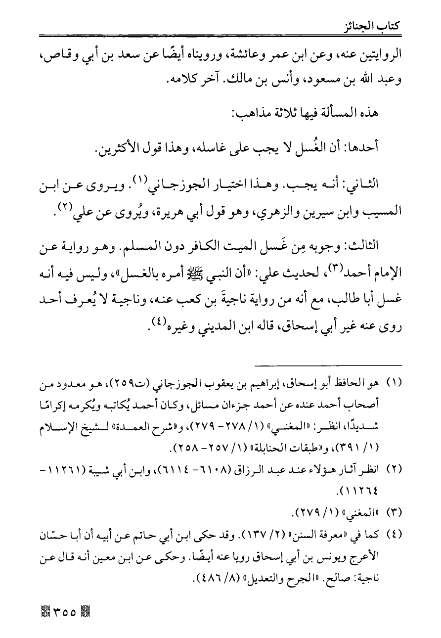 (¬١) هو الحافظ أبو إسحاق، إبراهيم بن يعقوب الجوزجاني (ت ٢٥٩)، هو معدود من أصحاب أحمد عنده عن أحمد جزءان مسائل، وكان أحمد يُكاتبه ويُكرمه إكرامًا شديدًا، انظر: «المغني» (١/ ٢٧٨ - ٢٧٩)، و «شرح العمدة» لشيخ الإسلام (١/ ٣٩١)، و «طبقات الحنابلة» (١/ ٢٥٧ - ٢٥٨).