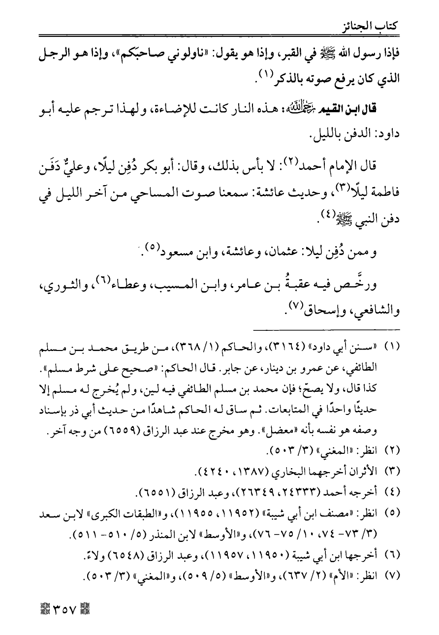 قال الإمام أحمد (¬٢): لا بأس بذلك، وقال: أبو بكر دُفِن ليلًا، وعليٌّ دَفَن فاطمة ليلًا (¬٣)، وحديث عائشة: سمعنا صوت المساحي من آخر الليل في دفن النبي - صلى الله عليه وسلم - (¬٤).