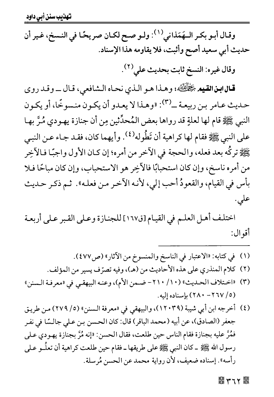 قال ابن القيم - رحمه الله -: وهذا هو الذي نحاه الشافعي، قال ــ وقد روى حديث عامر بن ربيعة ــ (¬٣): «وهذا لا يعدو أن يكون منسوخًا، أو يكون النبي - صلى الله عليه وسلم - قام لها لعلةٍ قد رواها بعض المُحدِّثين مِن أن جنازة يهودي مُرَّ بها على النبي - صلى الله عليه وسلم - فقام لها كراهية أن تَطُوله (¬٤). وأيهما كان، فقد جاء عن النبي - صلى الله عليه وسلم - تركُه بعد فعله، والحجة في الآخر من أمره؛ إن كان الأول واجبًا فالآخِر من أمره ناسخ، وإن كان استحبابًا فالآخِر هو الاستحباب، وإن كان مباحًا فلا بأس في القيام، والقعودُ أحب إلي، لأنه الآخر من فعله». ثم ذكر حديث علي.
