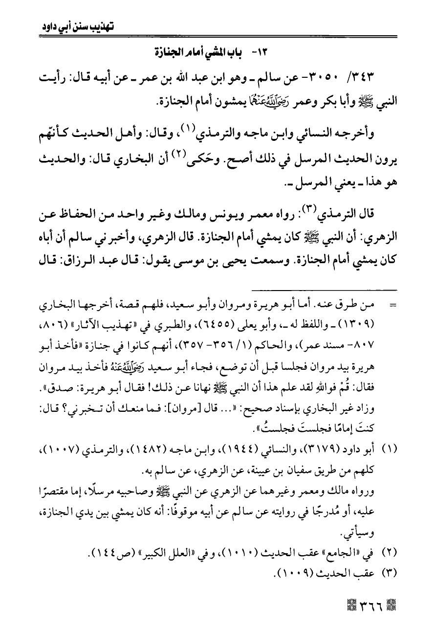 ٣٤٣/ ٣٠٥٠ - عن سالم ــ وهو ابن عبد الله بن عمر ــ عن أبيه قال: رأيت النبي - صلى الله عليه وسلم - وأبا بكر وعمر - رضي الله عنهما - يمشون أمام الجنازة.