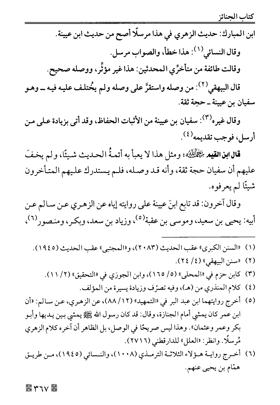 (¬٥) أخرج روايتهما ابن عبد البر في «التمهيد» (١٢/ ٨٨)، عن الزهري، عن سالم: «أن ابن عمر كان يمشي أمام الجنازة، وقال: قد كان رسول الله - صلى الله عليه وسلم - يمشي بين يديها وأبو بكر وعمر وعثمان». وهذا ليس صريحًا في الوصل، بل الظاهر أن آخره كلام الزهري مُرسلًا. وانظر: «العلل» للدارقطني (٢٧١٦).