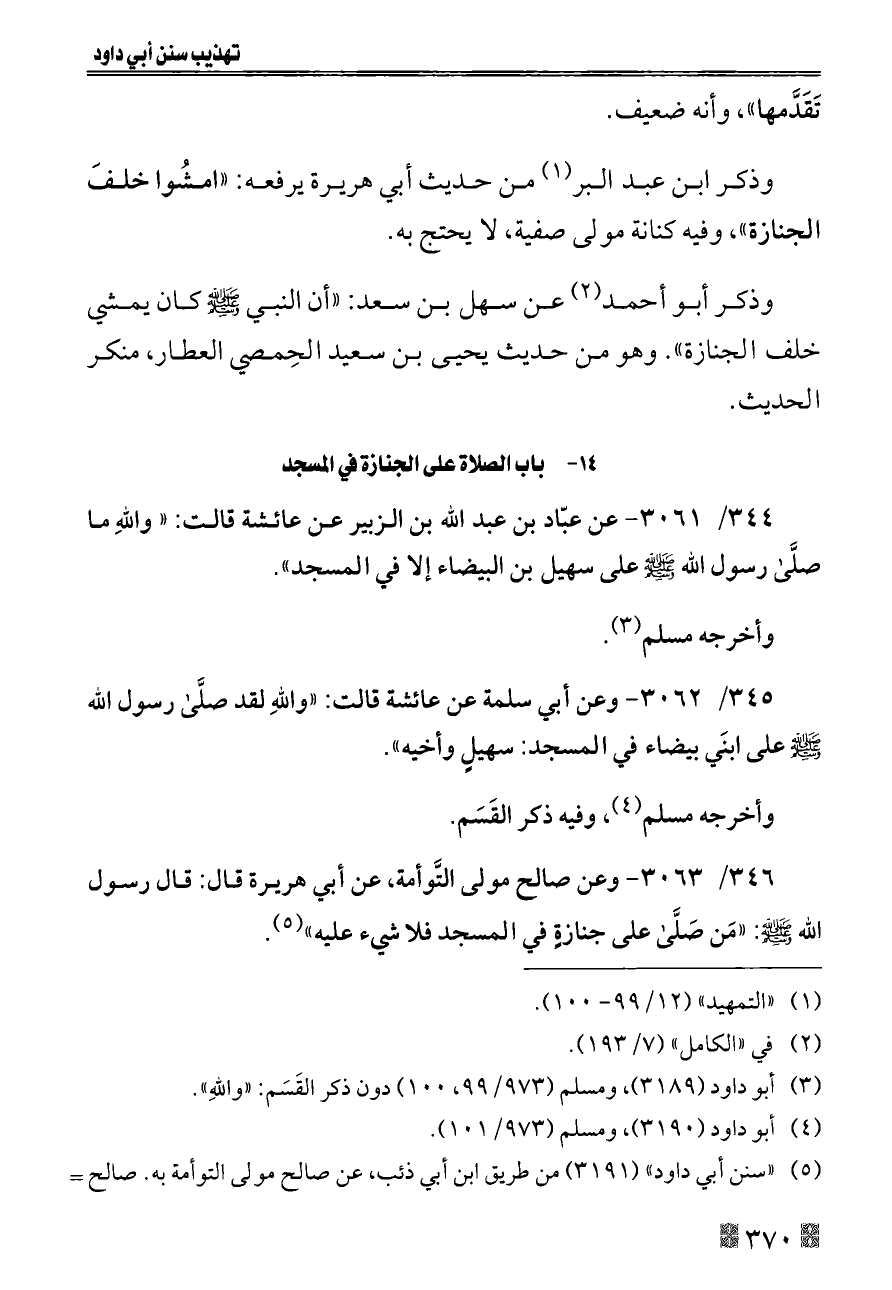 ٣٤٥/ ٣٠٦٢ - وعن أبي سلمة عن عائشة قالت: «واللهِ لقد صلَّى رسول الله - صلى الله عليه وسلم - على ابنَي بيضاء في المسجد: سهيلٍ وأخيه».