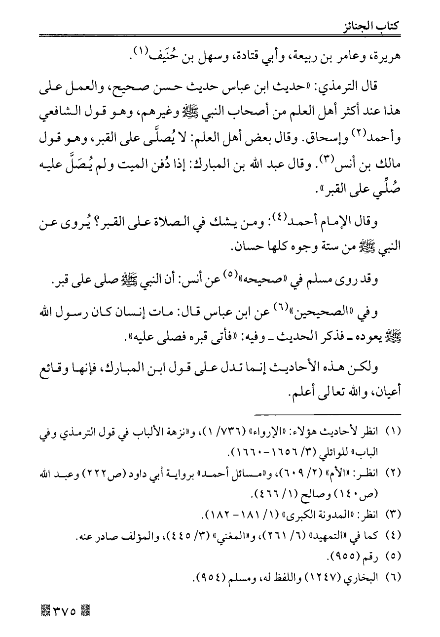 قال الترمذي: «حديث ابن عباس حديث حسن صحيح، والعمل على هذا عند أكثر أهل العلم من أصحاب النبي - صلى الله عليه وسلم - وغيرهم، وهو قول الشافعي وأحمد (¬٢) وإسحاق. وقال بعض أهل العلم: لا يُصلَّى على القبر، وهو قول مالك بن أنس (¬٣). وقال عبد الله بن المبارك: إذا دُفن الميت ولم يُصَلَّ عليه صُلِّي على القبر».