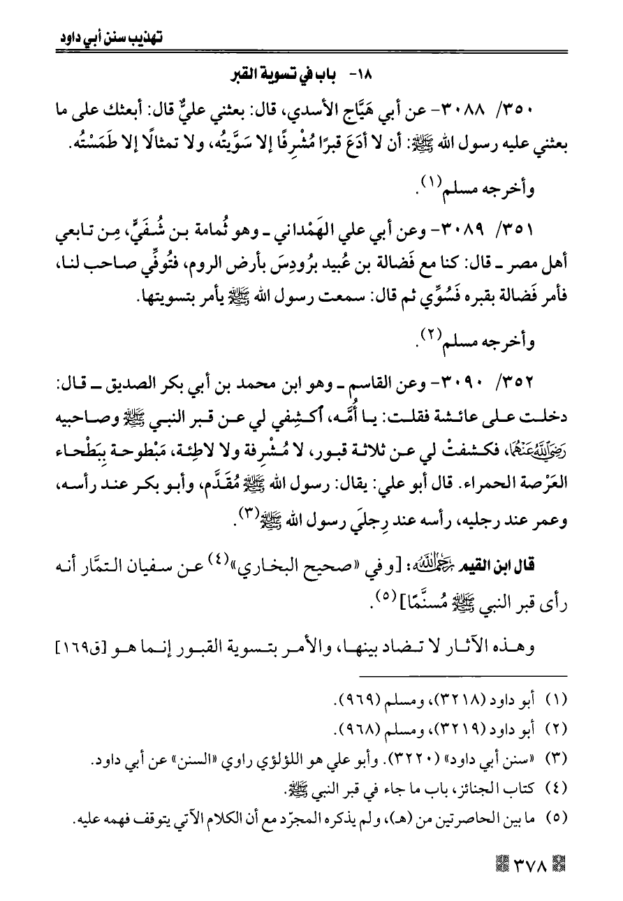 ٣٥١/ ٣٠٨٩ - وعن أبي علي الهَمْداني ــ وهو ثُمامة بن شُفَيٍّ، مِن تابعي أهل مصر ــ قال: كنا مع فَضالة بن عُبيد برُودِسَ بأرض الروم، فتُوفِّي صاحب لنا، فأمر فَضالة بقبره فَسُوِّي ثم قال: سمعت رسول الله - صلى الله عليه وسلم - يأمر بتسويتها.