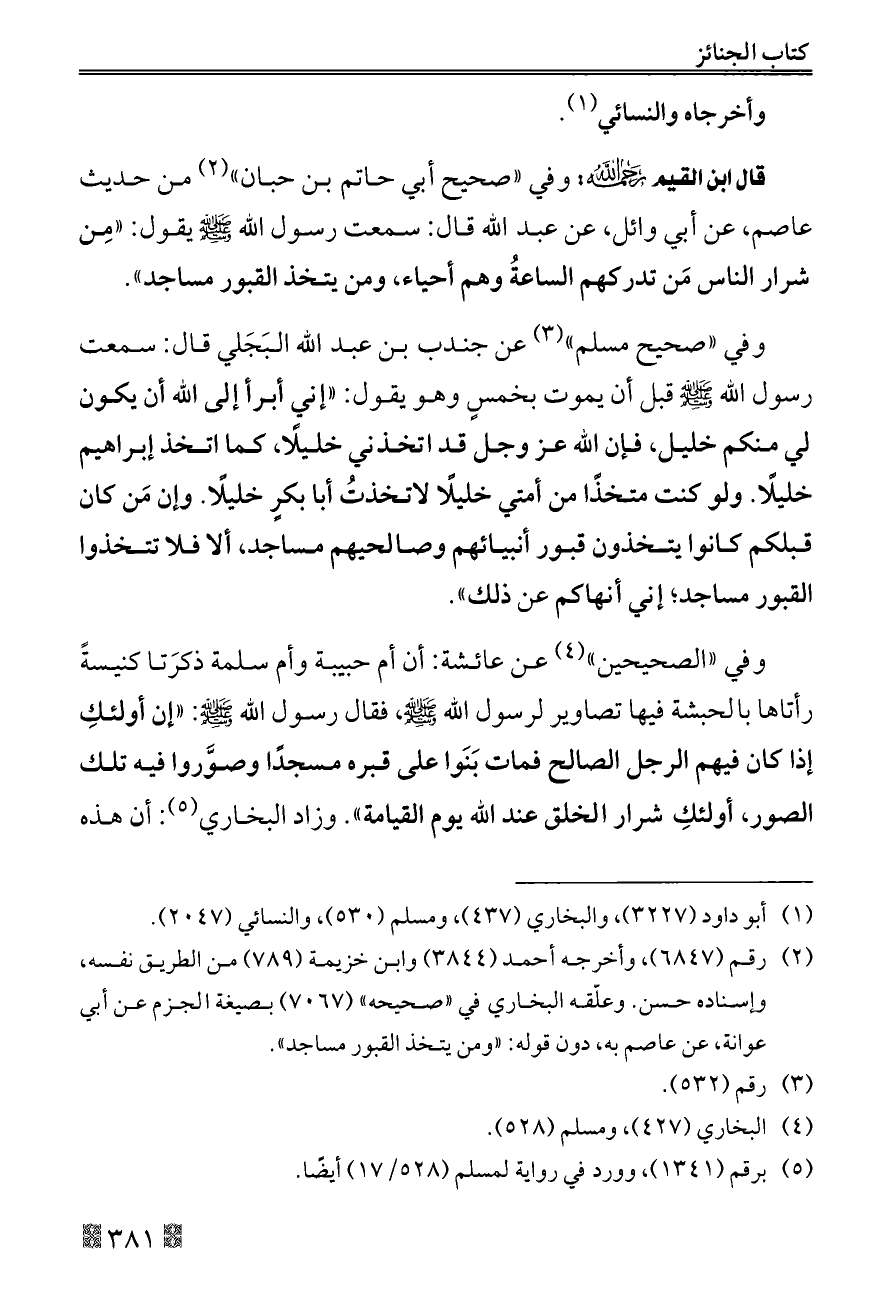 قال ابن القيم - رحمه الله -: وفي «صحيح أبي حاتم بن حبان» (¬٢) من حديث عاصم، عن أبي وائل، عن عبد الله قال: سمعت رسول الله - صلى الله عليه وسلم - يقول: «مِن شرار الناس مَن تدركهم الساعةُ وهم أحياء، ومن يتخذ القبور مساجد».