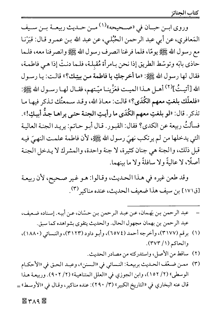 وروى ابن حبان في «صحيحه» (¬١) من حديث ربيعة بن سيف المَعافري، عن أبي عبد الرحمن الحُبُلي، عن عبد الله بن عمرو قال: قبَرْنا مع رسول الله - صلى الله عليه وسلم - يومًا، فلما فرغنا انصرف رسول الله - صلى الله عليه وسلم - وانصرفنا معه، فلما حاذى بابَه وتوسّط الطريق إذا نحن بامرأة مُقبِلة، فلما دنتْ إذا هي فاطمة، فقال لها رسول الله - صلى الله عليه وسلم -: «ما أخرجكِ يا فاطمة من بيتِك؟» قالت: يا رسول الله [أتيتُ] (¬٢) أهل هذا الميت فعَزَّينا ميّتهم، فقال لها رسول الله - صلى الله عليه وسلم -: «فلعلّك بلغتِ معهم الكُدَى؟» قالت: معاذ الله، وقد سمعتُك تذكر فيها ما تذكر. قال: «لو بلغتِ معهم الكُدَى ما رأيتِ الجنة حتى يراها جدُّ أبيكِ!». فسألتُ ربيعة عن الكدى؟ فقال: القبور. قال أبو حاتم: يريد الجنة العالية التي يدخلها من لم يرتكب نهيَ رسول الله - صلى الله عليه وسلم -، لأن فاطمة علمت النهيَ فيه قبل ذلك، والجنة هي جنان كثيرة، لا جنة واحدة، والمشرك لا يدخل الجنة أصلًا، لا عاليةً ولا سافلةً ولا ما بينهما.