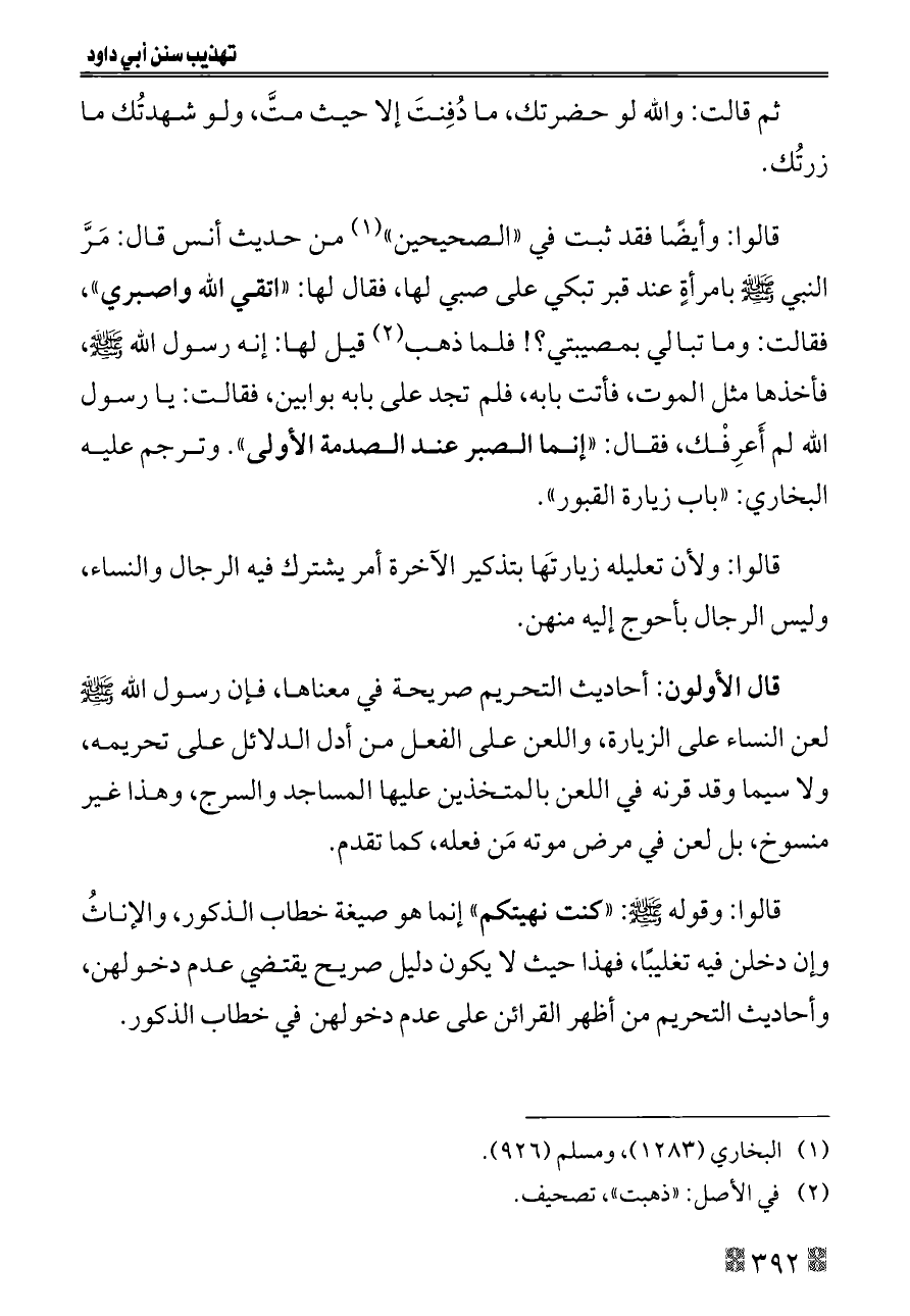 قالوا: وأيضًا فقد ثبت في «الصحيحين» (¬١) من حديث أنس قال: مَرَّ النبي - صلى الله عليه وسلم - بامرأةٍ عند قبر تبكي على صبي لها، فقال لها: «اتقي الله واصبري»، فقالت: وما تبالي بمصيبتي؟! فلما ذهب (¬٢) قيل لها: إنه رسول الله - صلى الله عليه وسلم -، فأخذها مثل الموت، فأتت بابه، فلم تجد على بابه بوابين، فقالت: يا رسول الله لم أَعرِفْك، فقال: «إنما الصبر عند الصدمة الأولى». وترجم عليه البخاري: «باب زيارة القبور».