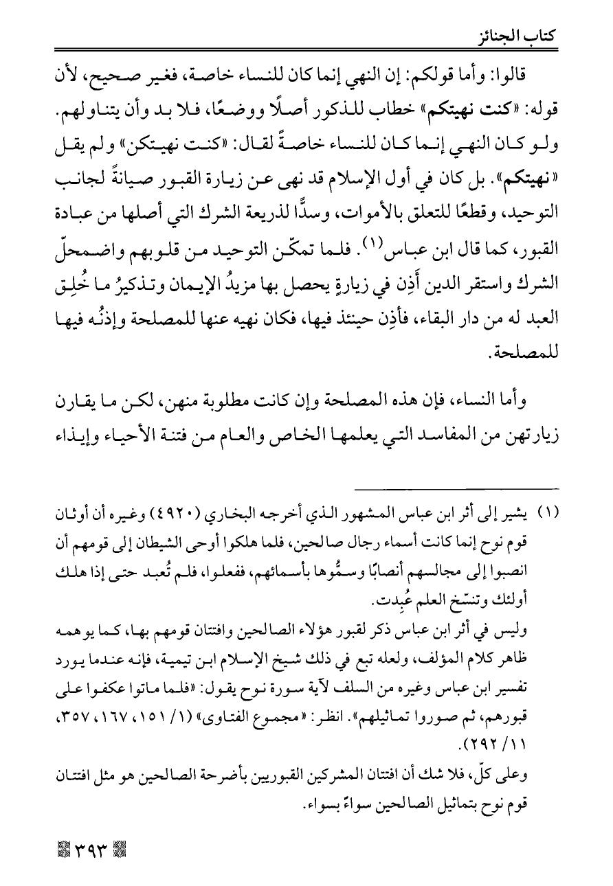 قالوا: وأما قولكم: إن النهي إنما كان للنساء خاصة، فغير صحيح، لأن قوله: «كنت نهيتكم» خطاب للذكور أصلًا ووضعًا، فلا بد وأن يتناولهم. ولو كان النهي إنما كان للنساء خاصةً لقال: «كنت نهيتكن» ولم يقل «نهيتكم». بل كان في أول الإسلام قد نهى عن زيارة القبور صيانةً لجانب التوحيد، وقطعًا للتعلق بالأموات، وسدًّا لذريعة الشرك التي أصلها من عبادة القبور، كما قال ابن عباس (¬١). فلما تمكّن التوحيد من قلوبهم واضمحلّ الشرك واستقر الدين أَذِن في زيارةٍ يحصل بها مزيدُ الإيمان وتذكيرُ ما خُلِق العبد له من دار البقاء، فأذِن حينئذ فيها، فكان نهيه عنها للمصلحة وإذنُه فيها للمصلحة.