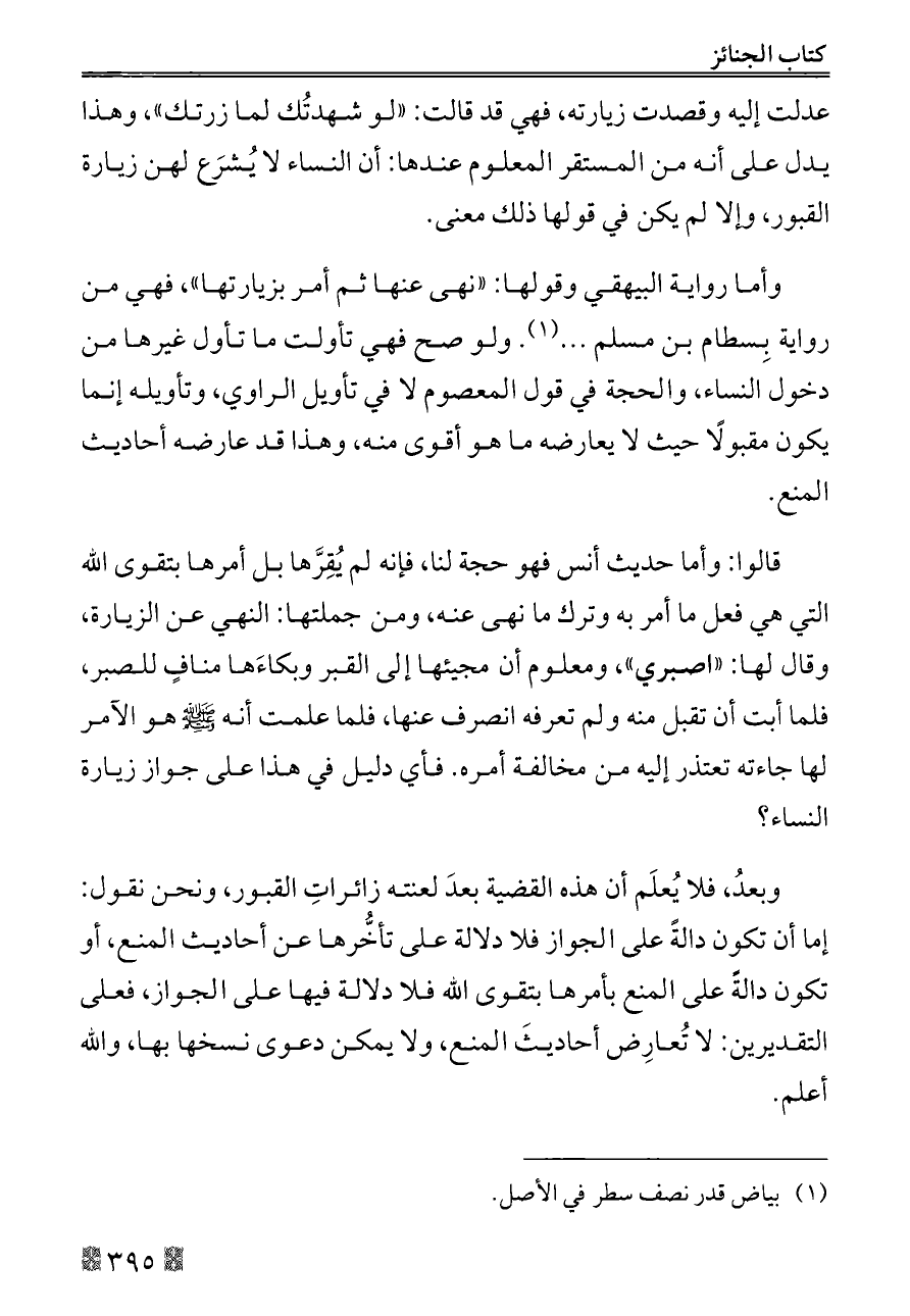 وبعدُ، فلا يُعلَم أن هذه القضية بعدَ لعنته زائراتِ القبور، ونحن نقول: إما أن تكون دالةً على الجواز فلا دلالة على تأخُّرها عن أحاديث المنع، أو تكون دالةً على المنع بأمرها بتقوى الله فلا دلالة فيها على الجواز، فعلى التقديرين: لا تُعارِض أحاديثَ المنع، ولا يمكن دعوى نسخها بها، والله أعلم.