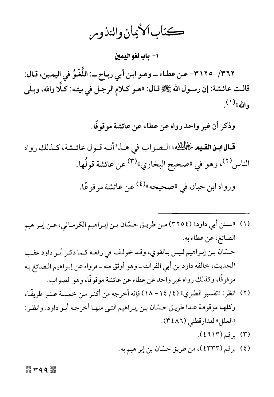 ٣٦٢/ ٣١٢٥ - عن عطاء ــ وهو ابن أبي رباح ــ: اللَّغْوُ في اليمين، قال: قالت عائشة: إن رسول الله - صلى الله عليه وسلم - قال: «هو كلام الرجل في بيته: كلَّا والله، وبلى والله» (¬١).
