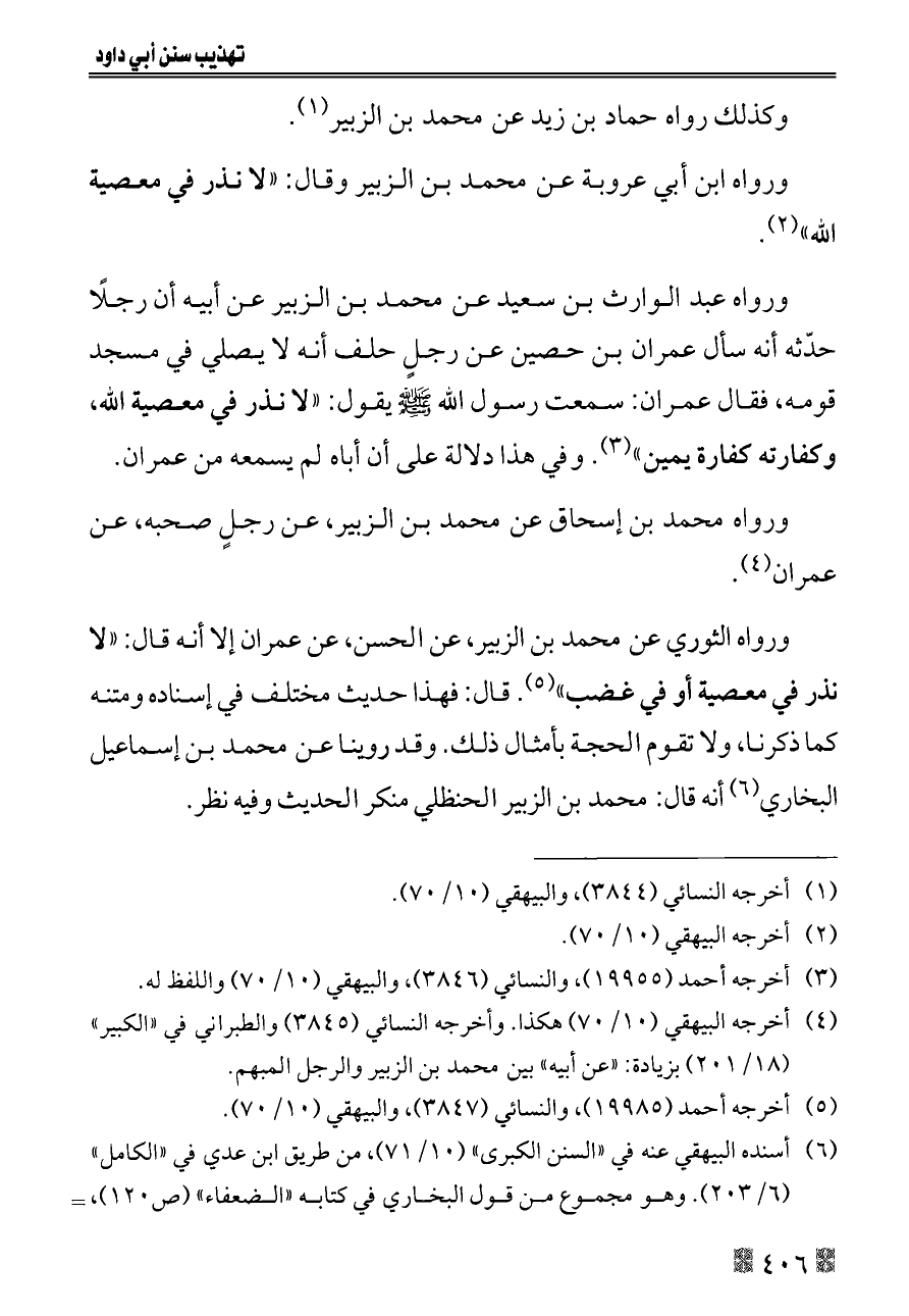 ورواه الثوري عن محمد بن الزبير، عن الحسن، عن عمران إلا أنه قال: «لا نذر في معصية أو في غضب» (¬٥). قال: فهذا حديث مختلف في إسناده ومتنه كما ذكرنا، ولا تقوم الحجة بأمثال ذلك. وقد روينا عن محمد بن إسماعيل البخاري (¬٦) أنه قال: محمد بن الزبير الحنظلي منكر الحديث وفيه نظر.