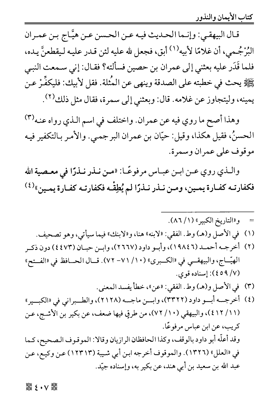قال البيهقي: وإنما الحديث فيه عن الحسن عن هيَّاج بن عمران البُرْجُمي، أن غلامًا لأبيه (¬١) أبق، فجعل لله عليه لئن قدر عليه ليقطعنَّ يده، فلما قَدَر عليه بعثني إلى عمران بن حصين فسألته؟ فقال: إني سمعت النبي - صلى الله عليه وسلم - يحث في خطبته على الصدقة وينهى عن المُثلة. فقل لأبيك: فليكفِّرْ عن يمينه، وليتجاوز عن غلامه. قال: وبعثني إلى سمرة، فقال مثل ذلك (¬٢).