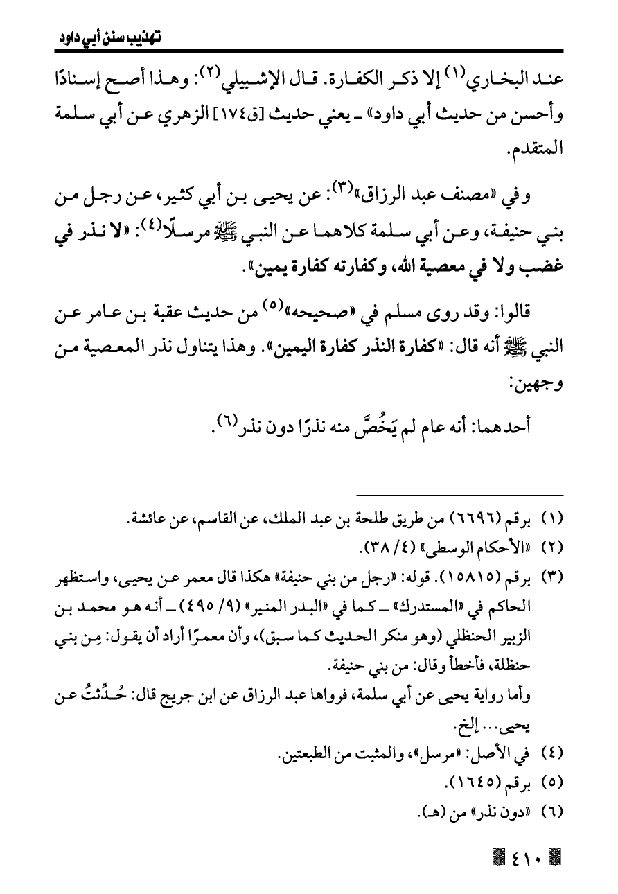 وفي «مصنف عبد الرزاق» (¬٣): عن يحيى بن أبي كثير، عن رجل من بني حنيفة، وعن أبي سلمة كلاهما عن النبي - صلى الله عليه وسلم - مرسلًا (¬٤): «لا نذر في غضب ولا في معصية الله، وكفارته كفارة يمين».