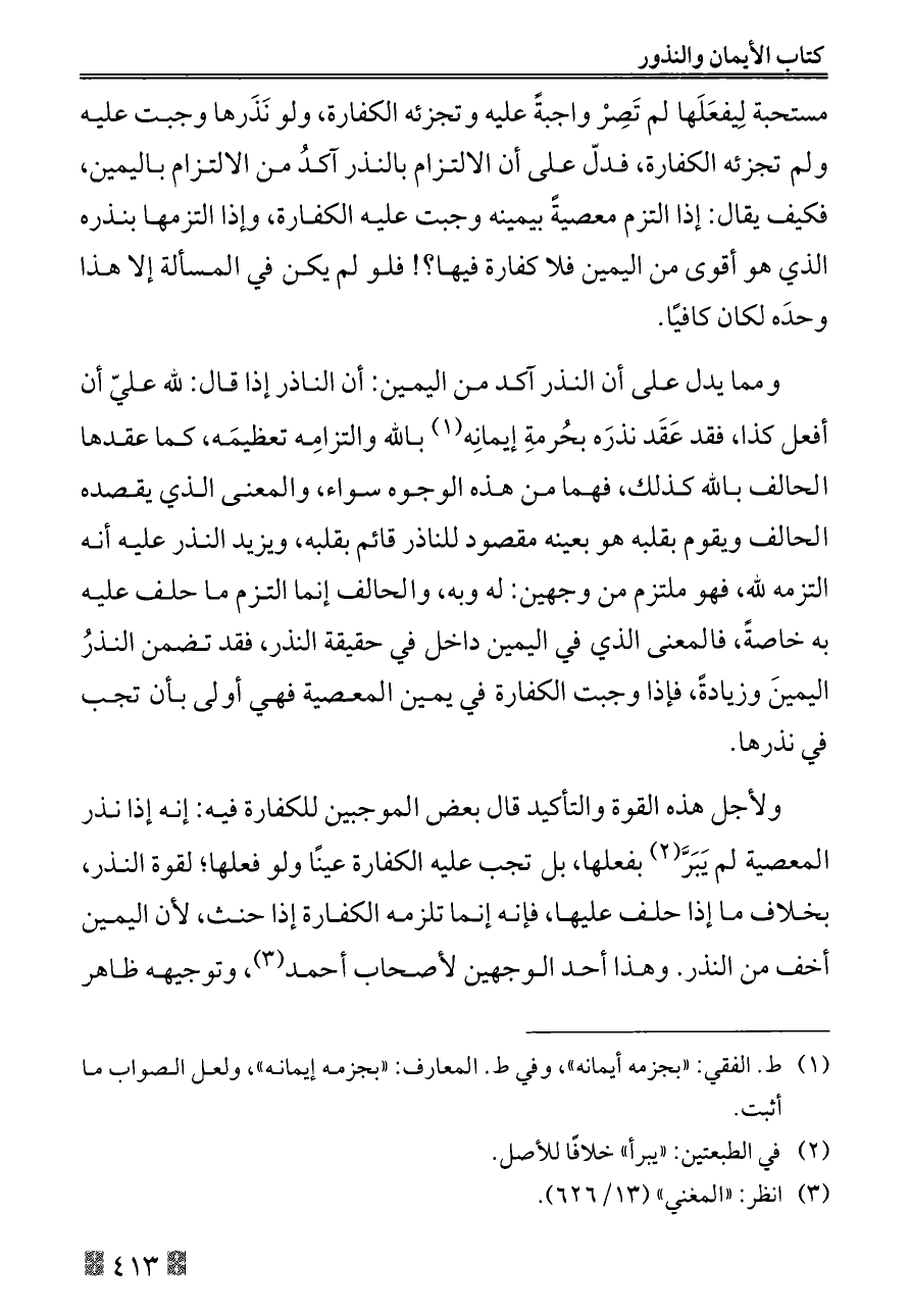 ولأجل هذه القوة والتأكيد قال بعض الموجبين للكفارة فيه: إنه إذا نذر المعصية لم يَبَرَّ (¬٢) بفعلها، بل تجب عليه الكفارة عينًا ولو فعلها؛ لقوة النذر، بخلاف ما إذا حلف عليها، فإنه إنما تلزمه الكفارة إذا حنث، لأن اليمين أخف من النذر. وهذا أحد الوجهين لأصحاب أحمد (¬٣)، وتوجيهه ظاهر