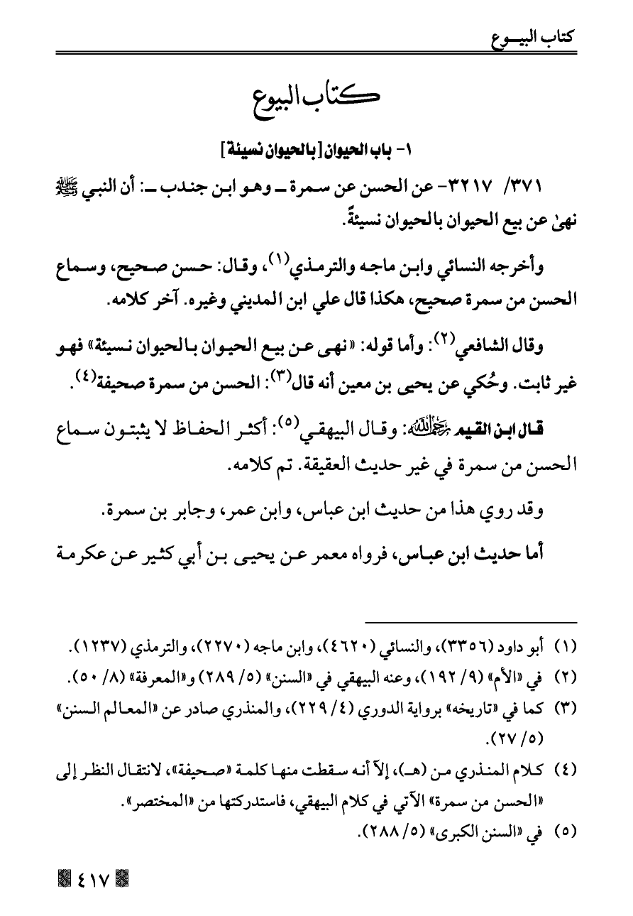 ٣٧١/ ٣٢١٧ - عن الحسن عن سمرة ــ وهو ابن جندب ــ: أن النبي - صلى الله عليه وسلم - نهى عن بيع الحيوان بالحيوان نسيئةً.