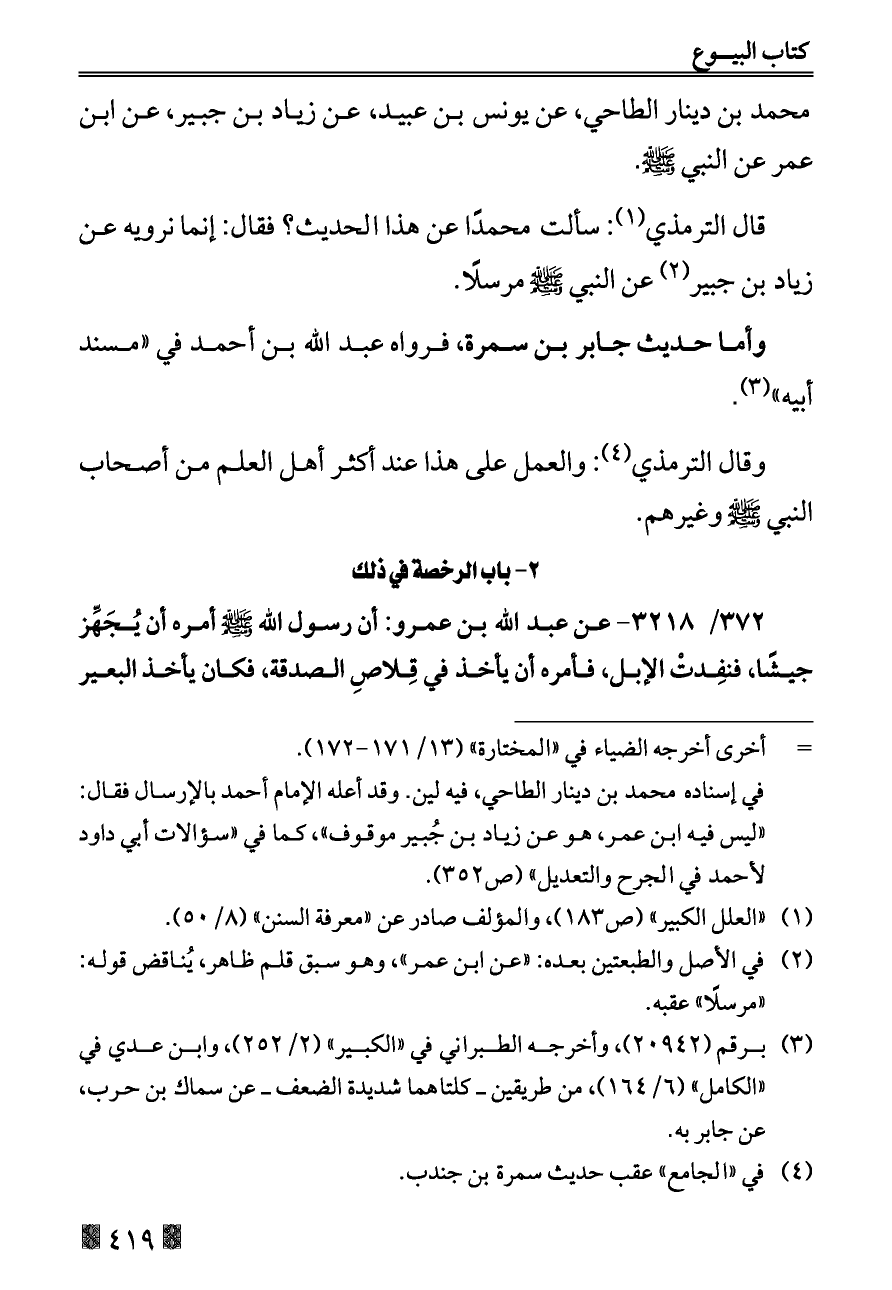 ٣٧٢/ ٣٢١٨ - عن عبد الله بن عمرو: أن رسول الله - صلى الله عليه وسلم - أمره أن يُجَهِّز جيشًا، فنفِدتْ الإبل، فأمره أن يأخذ في قِلاصِ الصدقة، فكان يأخذ البعير