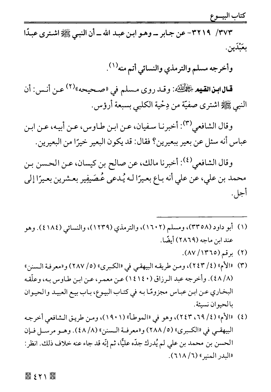٣٧٣/ ٣٢١٩ - عن جابر ــ وهو ابن عبد الله ــ أن النبي - صلى الله عليه وسلم - اشترى عبدًا بعَبْدَين.