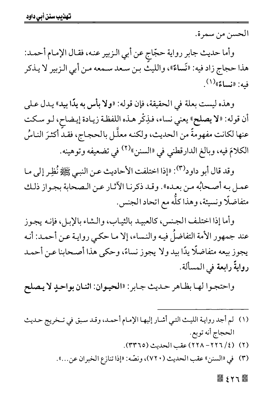 وأما حديث جابر رواية حجّاجٍ عن أبي الزبير عنه، فقال الإمام أحمد: هذا حجاج زاد فيه: «نَساءً»، والليث بن سعد سمعه من أبي الزبير لا يذكر فيه: «نساءً» (¬١).