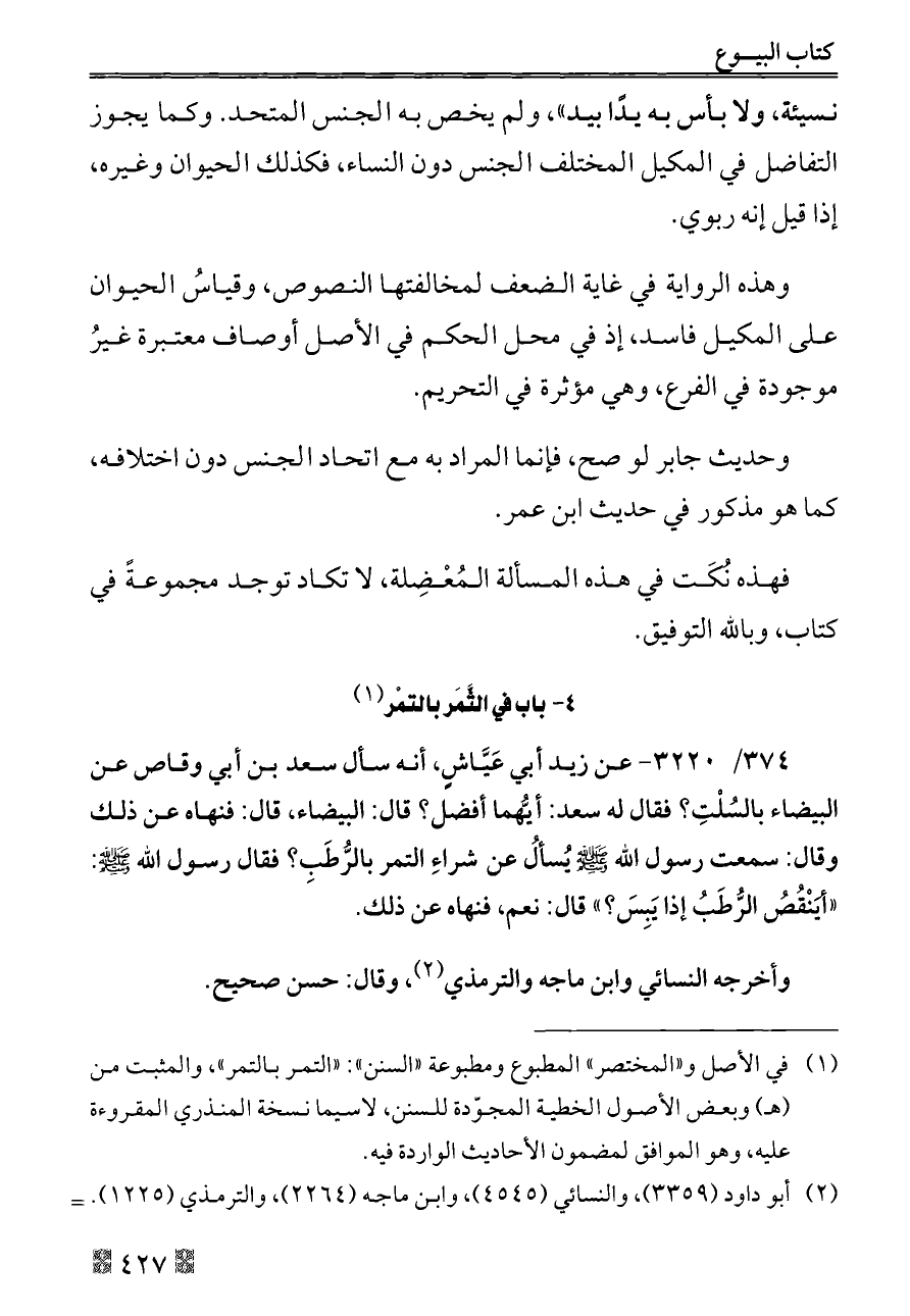 ٣٧٤/ ٣٢٢٠ - عن زيد أبي عَيَّاشٍ، أنه سأل سعد بن أبي وقاص عن البيضاء بالسُلْتِ؟ فقال له سعد: أيُّهما أفضل؟ قال: البيضاء، قال: فنهاه عن ذلك وقال: سمعت رسول الله - صلى الله عليه وسلم - يُسألُ عن شراءِ التمر بالرُّطَبِ؟ فقال رسول الله - صلى الله عليه وسلم -: «أيَنْقُصُ الرُّطَبُ إذا يَبِسَ؟» قال: نعم، فنهاه عن ذلك.