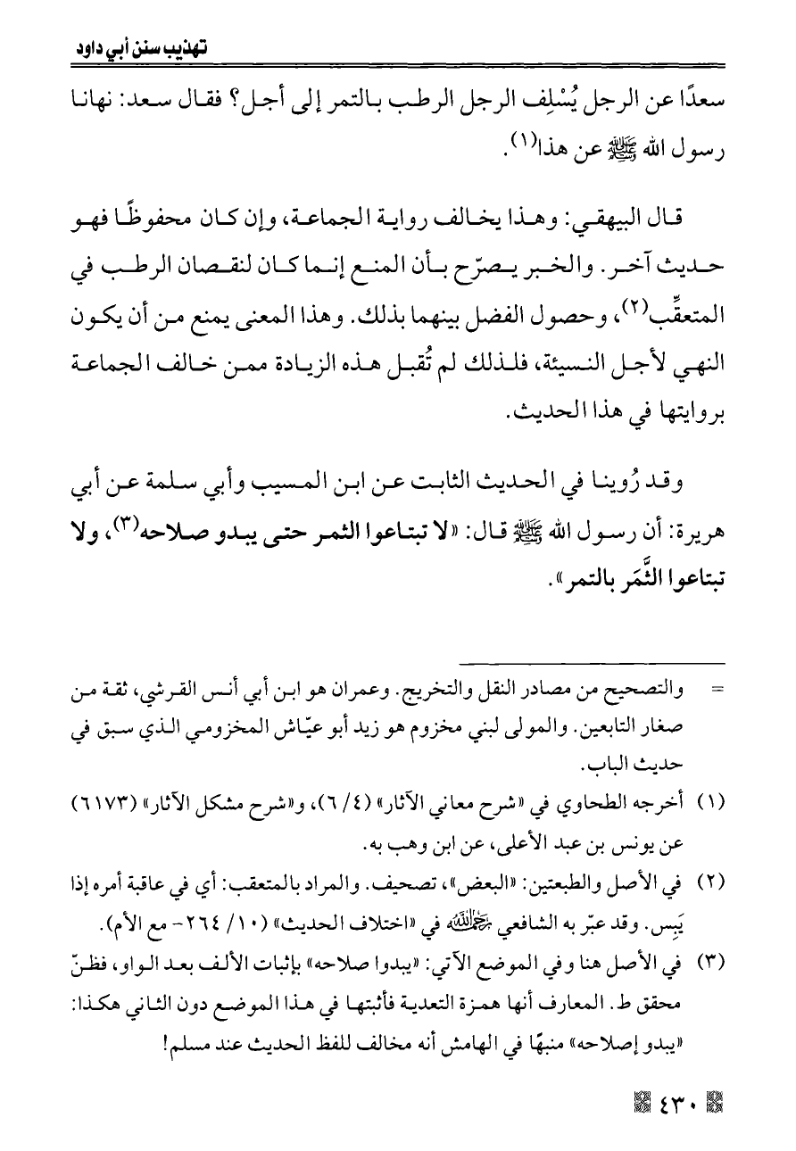 (¬٣) في الأصل هنا وفي الموضع الآتي: «يبدوا صلاحه» بإثبات الألف بعد الواو، فظنّ محقق ط. المعارف أنها همزة التعدية فأثبتها في هذا الموضع دون الثاني هكذا: «يبدو إصلاحه» منبهًا في الهامش أنه مخالف للفظ الحديث عند مسلم!