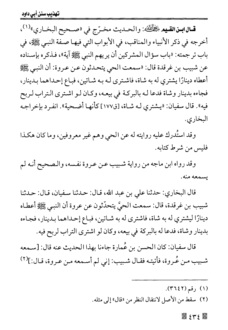 قال ابن القيم - رحمه الله -: والحديث مخرّج في «صحيح البخاري» (¬١)، أخرجه في ذكر الأنبياء والمناقب، في الأبواب التي فيها صفة النبي - صلى الله عليه وسلم -، في باب ترجمته: «باب سؤال المشركين أن يريهم النبي - صلى الله عليه وسلم - آية»، فذكره بإسناده عن شبيب بن غرقدة قال: «سمعت الحي يتحدثون عن عروة: أن النبي - صلى الله عليه وسلم - أعطاه دينارًا يشتري له به شاة، فاشترى له به شاتين، فباع إحداهما بدينار، فجاءه بدينار وشاة فدعا له بالبركة في بيعه، وكان لو اشترى التراب لربح فيه». قال سفيان: «يشتري له شاة، [ق ١٧٧] كأنها أضحية». انفرد بإخراجه البخاري.