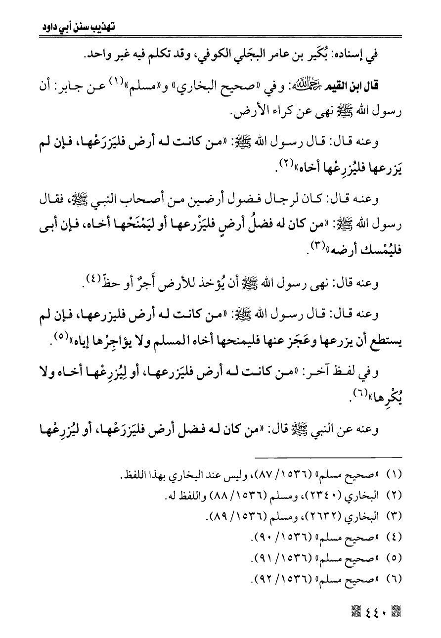 قال ابن القيم - رحمه الله -: وفي «صحيح البخاري» و «مسلم» (¬١) عن جابر: أن رسول الله - صلى الله عليه وسلم - نهى عن كراء الأرض.
